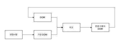 과거에는(Ajax등의 기술을 이용해) 직접적으로 문서 객체 모델을 조작해서 변경사항을 그려냈었다(from1). 오늘날에도 이러한 본질이 변하진 않았다. 하지만 리액트와 뷰도 마찬가지로 이렇게 ‘전부 들어냈다가 다시 배치하는’ 방식이 비효율적이라고 보았던 것이다. 리액트와 뷰는 문서 객체 모델을 직접적으로 손대기 전, 가상 문서 객체 모델로 최적의 변경 요소들을 다듬어낸다. 그리고 마지막에 이들을 한번에 움직이도록 한다(참고1).