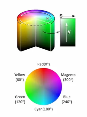 Hue: 색상. 빨강은 0도, 노랑은 60도, 초록은 120도 이런 식으로 표현한다.