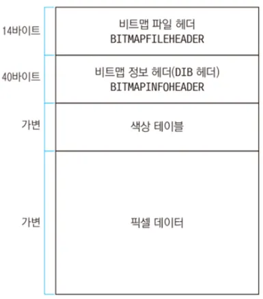 비트맵 정보 헤더: 비트맵 영상의 가로세로 크기, 이미지의 크기, 픽셀 강도를 표현하기 위해 사용하는 비트의 수 등 정보들이 담긴다.