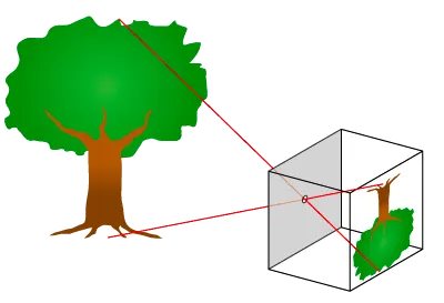 실제 세계의 물체에서 출발한 빛이 작은 구멍을 지나 상자 속 스크린에 비치게 된다.