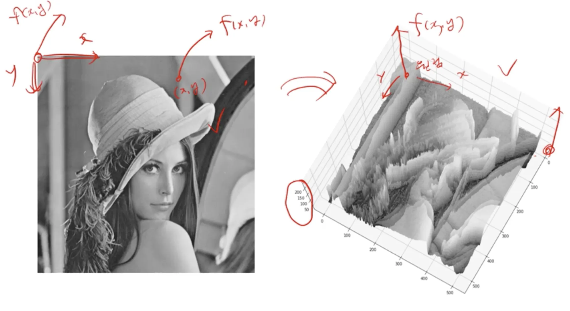 영상은 함수처럼 바라볼 수 있다. 영상은 원점이 좌상단이고 픽셀 강도라는 함수값을 가진 함수다.