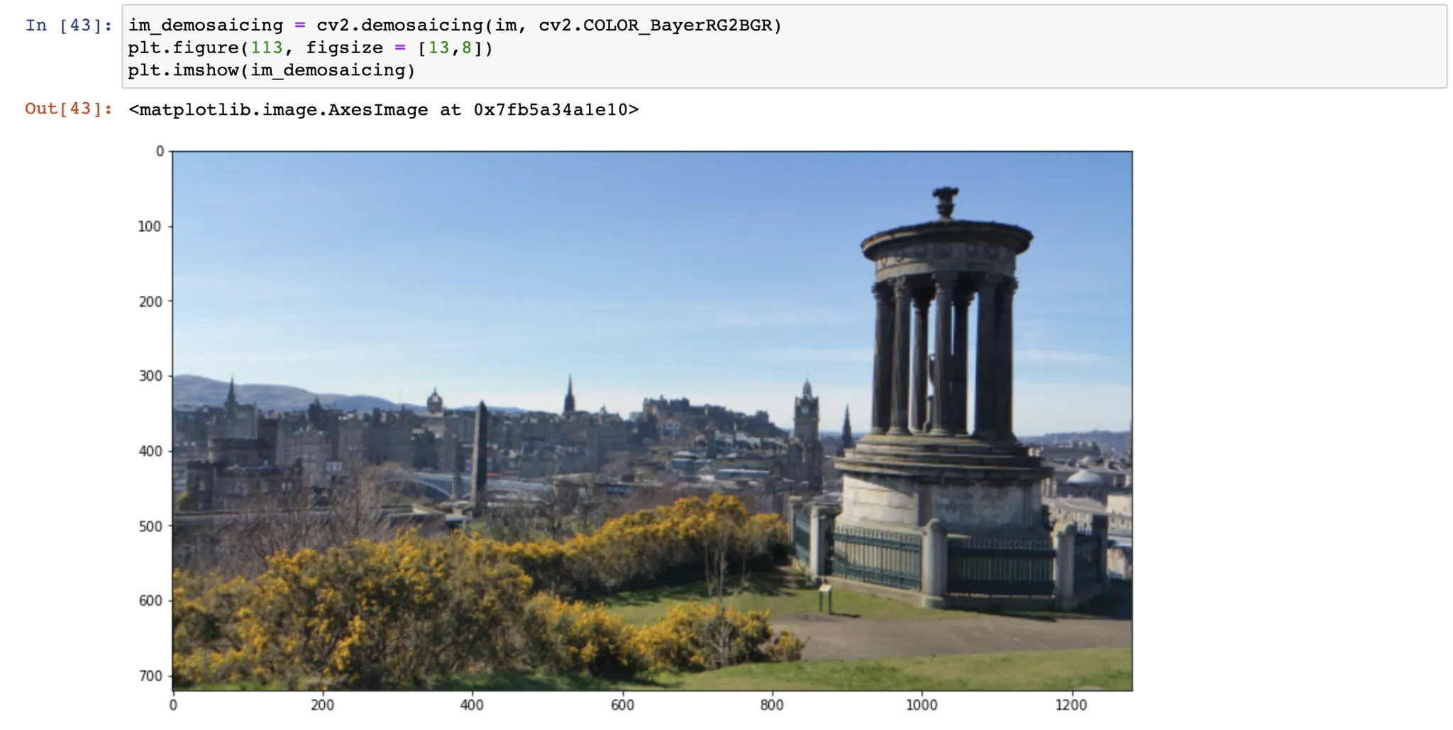 하나의 색상만을 수집하며 다른 색상의 강도를 측정하지 못하는 문제를 보간법을 통해 해결한다.