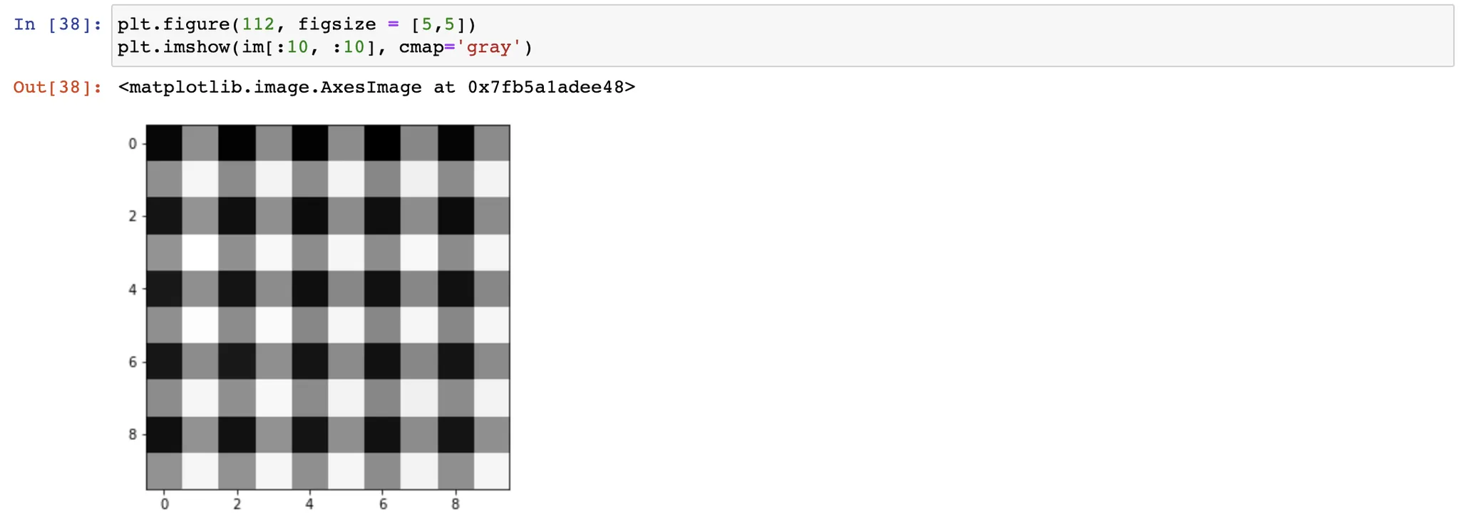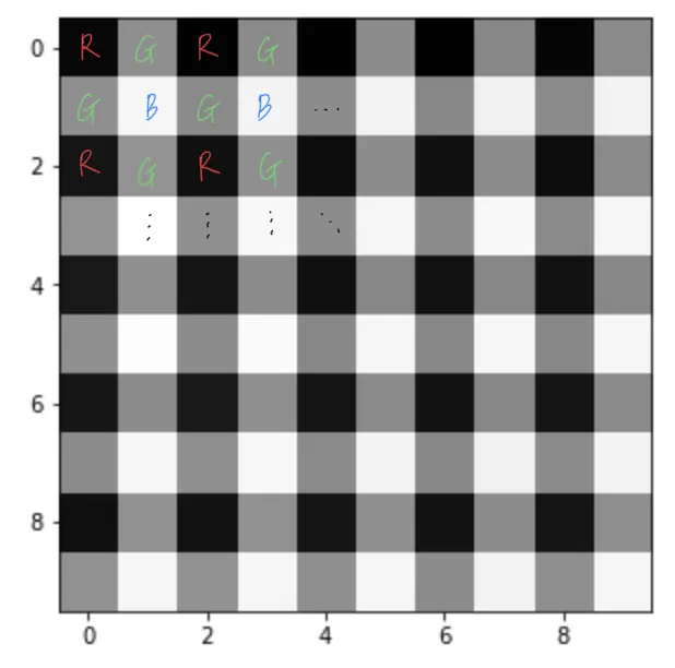 RAW PNG에서 좌상단부터 가로세로 10개 픽셀만 확대해 보자. 아래와 같은 격자무늬를 확인할 수 있는데, 이것이 베이어 필터를 거친 후, 아무런 처리도 하지 않은 픽셀 강도이기 때문이다.