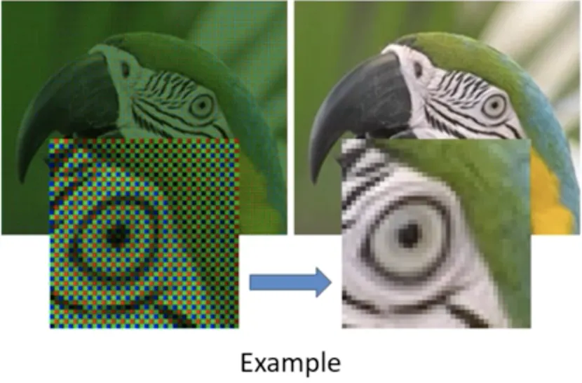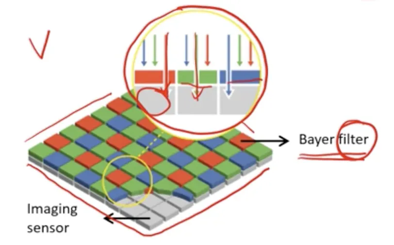픽셀마다 다른 색상 필터를 번갈아 가며 배치하기 때문에, 하나의 픽셀은 하나의 색상만 수집이 가능하다.