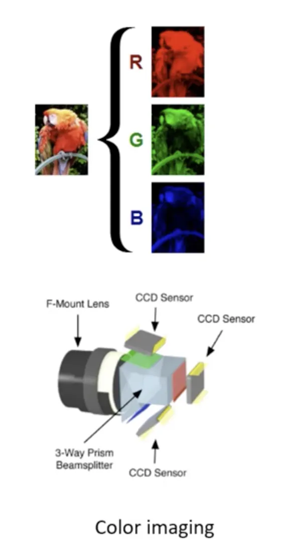자연광을 세 개의 R, G, B 채널로 분리하기 위해 카메라 내부에 프리즘을 배치하기도 했다.