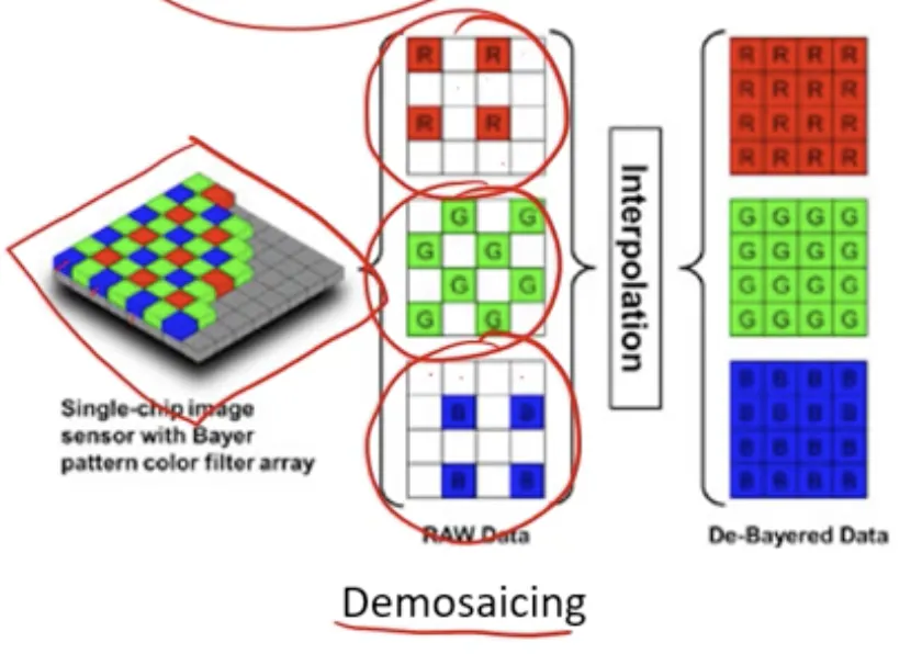 1개의 이미지 센서로부터 RGB 영상을 얻기 위해 설계된 필터를 베이어 필터(bayer filter)라고 한다. 베이어 필터에서 R, G, B 필터를 교차해 배치하면서 수집하지 못하는 색상의 빛을 채워넣는 것을 디모자이킹(Demosaicing)이라고 한다. 디모자이킹을 위해 다양한 보간(interpolation)법이 사용된다.