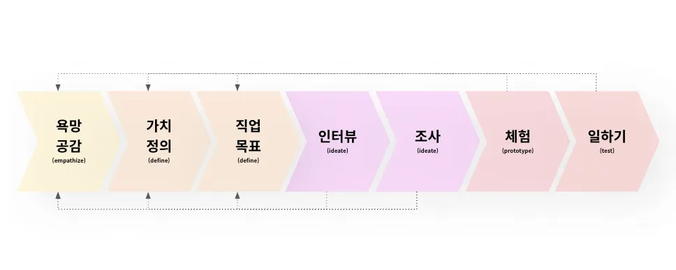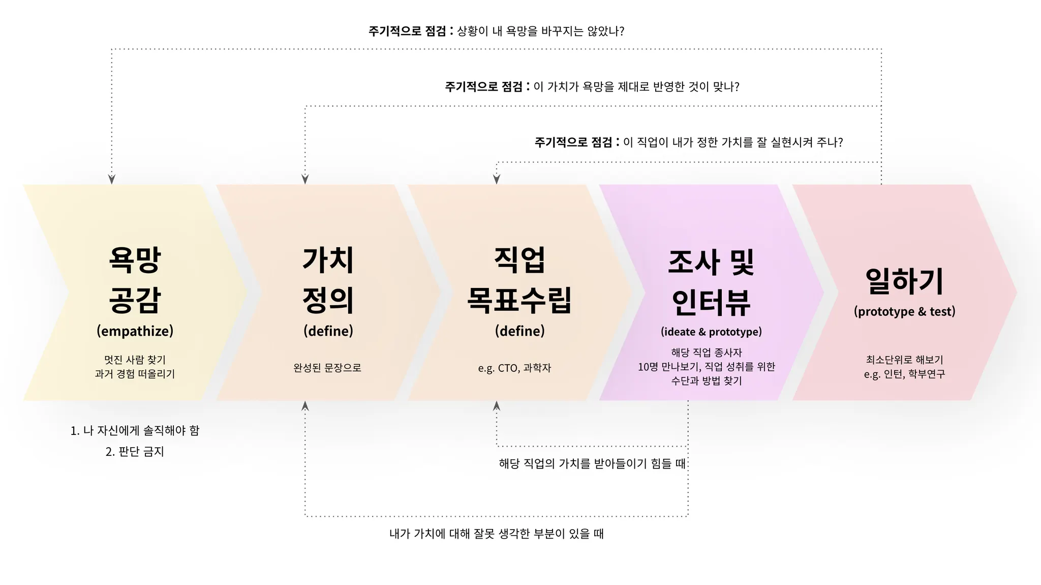 목표를 수립했다고 바로 일자리를 구하는 잡플래닛이나 링크드인에 들어가는 것이 아니다. 얼굴에 철판을 깔고서라도 그 직업이나 해당 가치를 이미 성취했다고 느껴지는 사람을 여러 명 인터뷰해 보는 IDEATE 단계를 거친다(from5). 그리고 해당 직업 그 자체에서 내가 누릴 수 있는 가치에 대해서 고민해야 한다. 가장 빠른 피드백 루프를 돌아서 삽질을 최소화해야 한다. 그 다음에 그 직업을 얻을 수 있는 ‘가장 빠른 방법’ 을 연구해 보자(from6). 이 작업에서도 마찬가지로 여러 질문을 던지며 피드백 루프를 돌며 삽질을 최소화한다(from8).