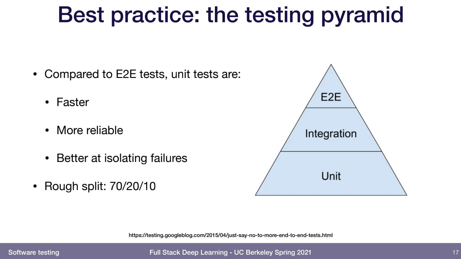 소프트웨어 테스팅(from1)의 모범 사례는 테스팅 피라미드이다. 테스팅 피라미드에 따라, 빠르고 쉽고 오류를 고립시킬 수 있고(from2) 안정적인 유닛 테스트를 가장 많이 가장 자주 하라.