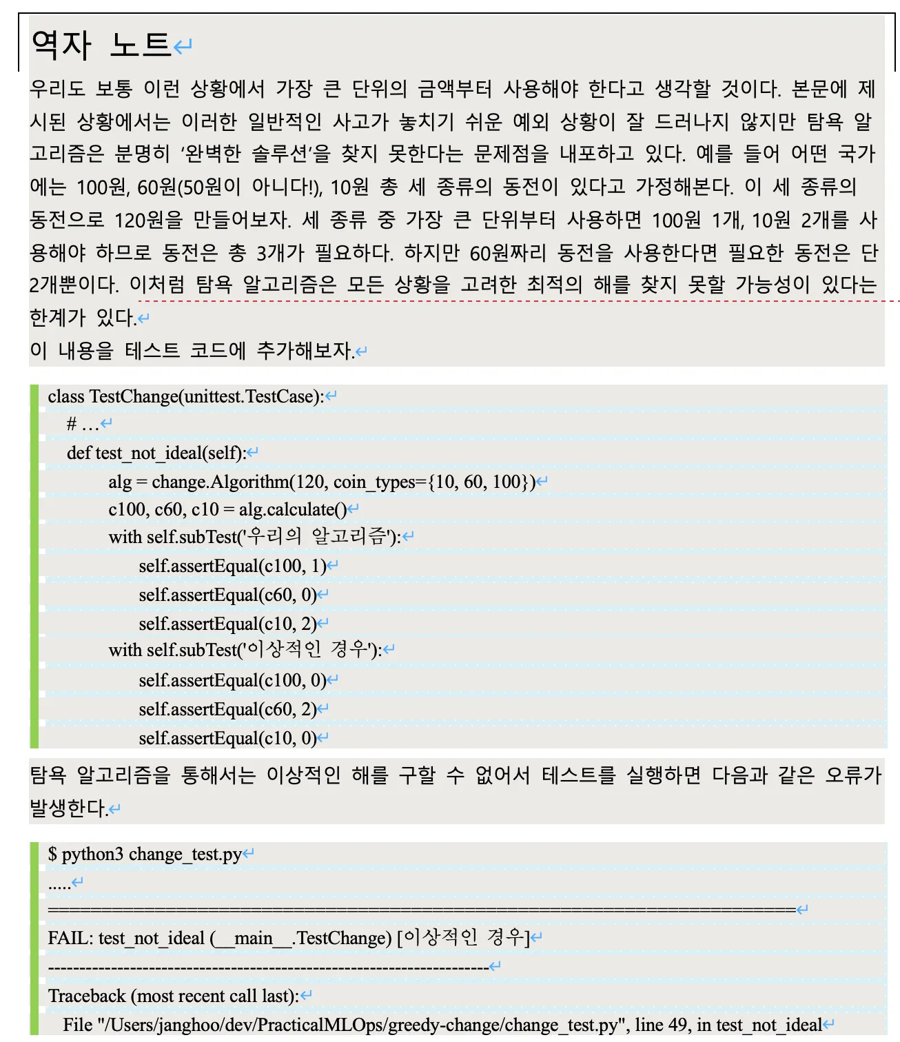 필자가 머신러닝이라는 개념을 그리디를 이용해 설명하는 과정에서 실습이 그 의도를 전혀 드러내지 못하고 있는 상황이었습니다. 그래서 역자 노트를 위와 같이 추가했습니다. 어떻게 역자 노트를 작성할 수 있는지에 대한 아이디어를 얻어 가세요. 저렇게 서식을 맞추어 작성할 필요는 없습니다. 내용을 추가해 주시면 저와 편집자님이 수정해 드리겠습니다.