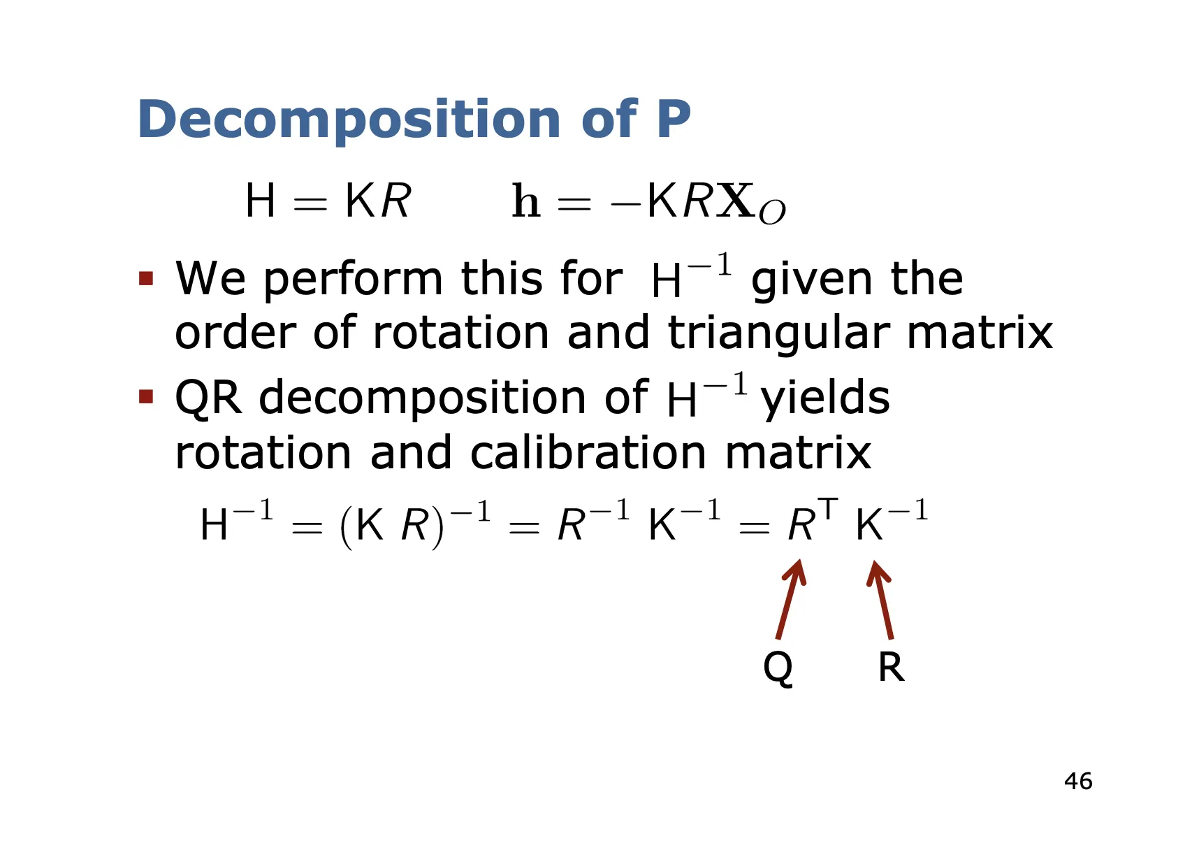 QR 분해의 결과물은 Q(직교) R(상삼각) 이지, R(상삼각) Q(직교) 가 아니다. 하지만 행렬은 연산의 순서가 중요하다(from1). 순서를 맞추어 주어야 한다. 회전 행렬의 전치행렬은 여전히 직교행렬이고(의문), 카메라 내부 행렬의 역행렬은 여전히 상삼각행렬이다(의문). 따라서 을 QR 분해함으로써 회전변환 행렬의 전치행렬과 카메라 내부행렬의 역행렬을 우선 얻어내는 방식으로 회전변환 행렬과 카메라 내부 행렬을 얻어낸다.