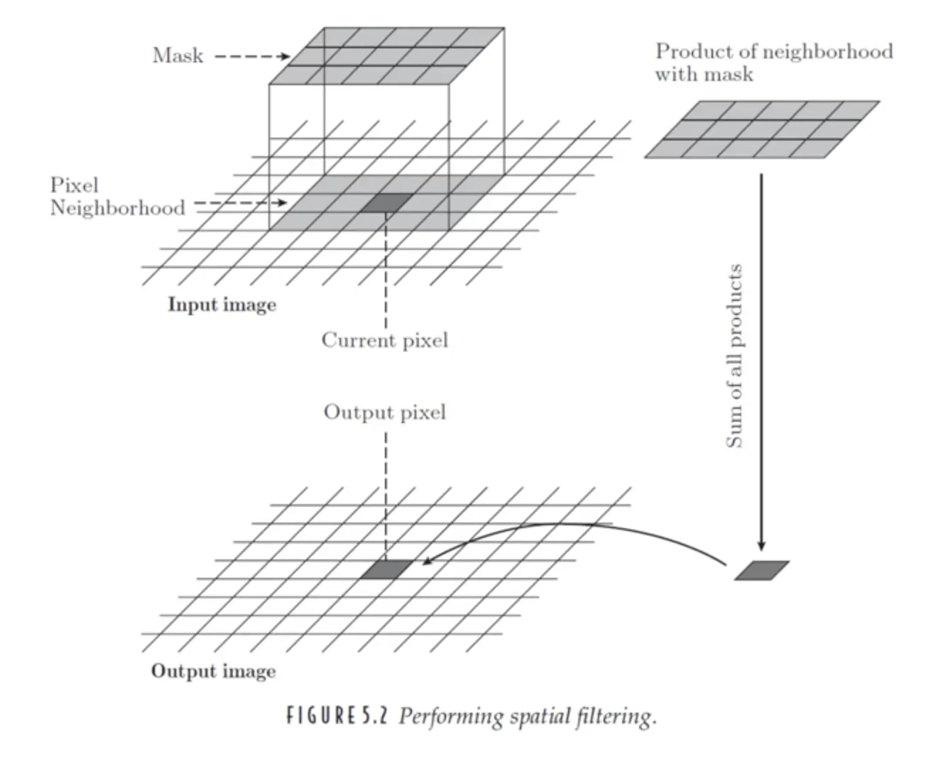 선형 필터(비선형 필터 말고)는 마스크 내의 모든 원소와 이에 대응하는 이웃 영역에 있는 모든 화소들의 값들에 임의의 곱셈 연산을 적용하고 이들을 모두 더하여 구현된다. 이를 공간 필터링(spatial filtering)이라고 한다.