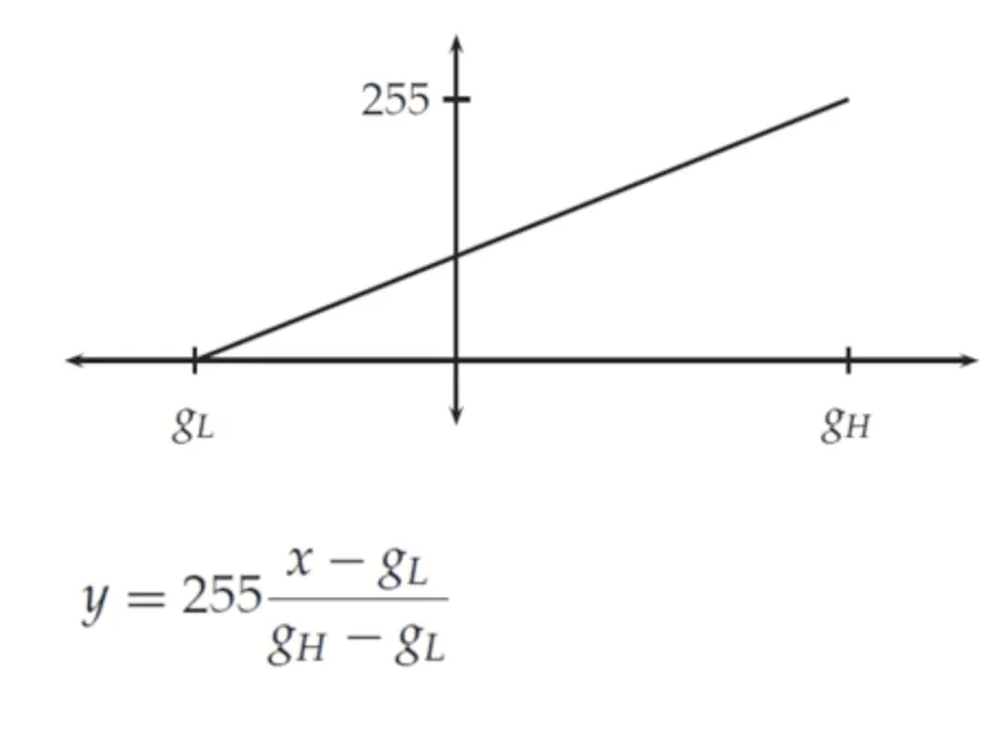필터링 결과의 최소값이 , 가장 큰 값이 라고 할 때 이고, 가 되도록 선형변환을 수행하는 방법이다.