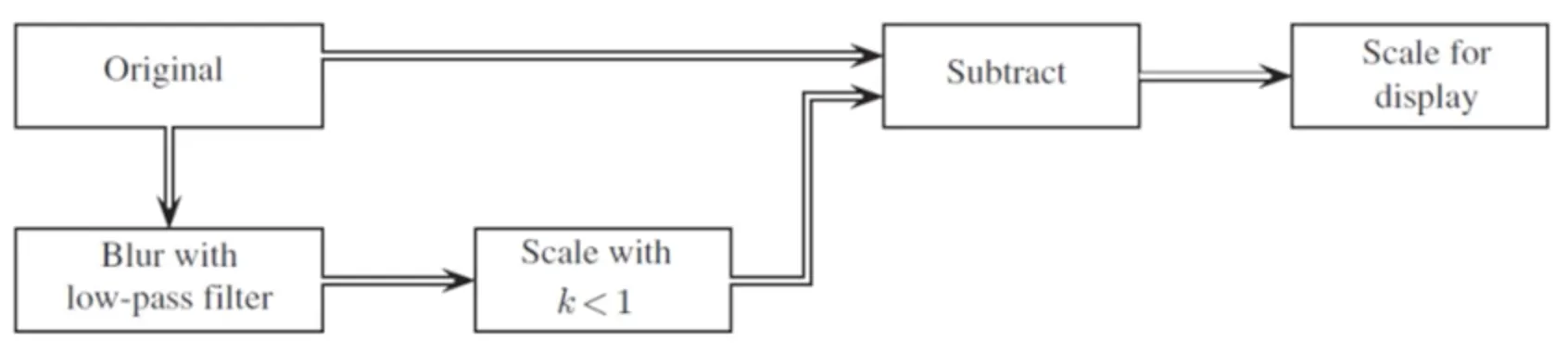원본 영상(a)의 저역 통과 필터를 거친 영상(b)를 원본 영상에서 빼 주면