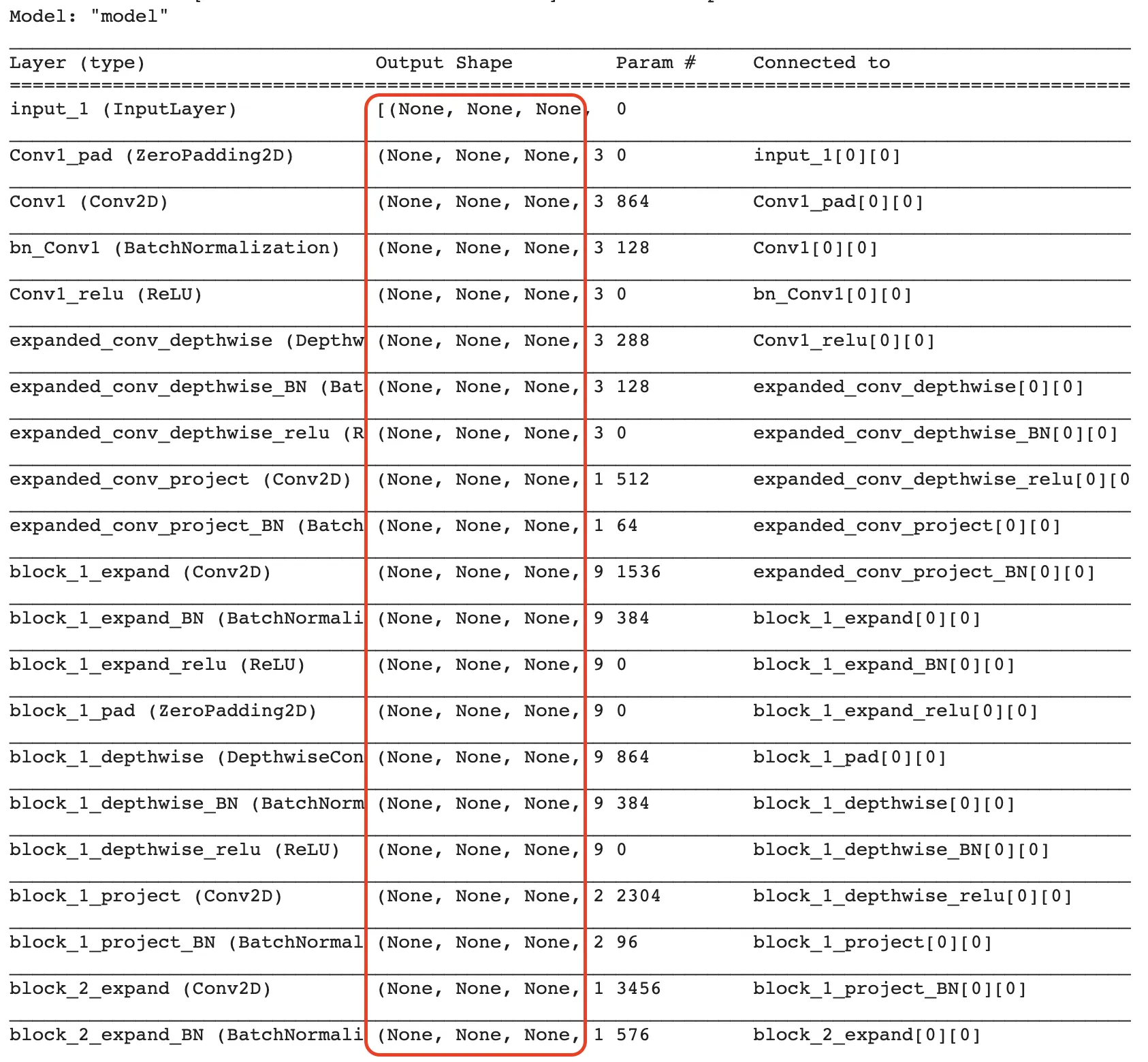 모델을 설계할 때 모든 사이즈를 미리 정해 두어야 한다는 것은 아니다. None shape 으로 모델을 만들어 두고, 런타임에 사이즈를 추론해도 상관없다. 하지만 한번 정해진 뒤 변하면 안된다.
