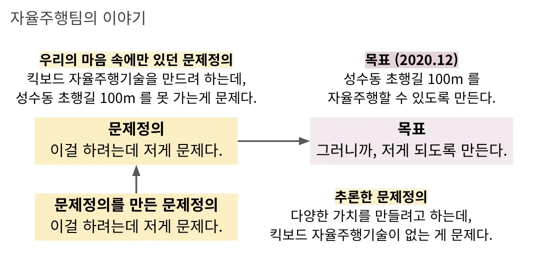 방금 만들어낸 가상의 문제정의에 대해서 “왜?” 라는 질문을 한번 더 던지고, 이 문제정의를 낳은 문제정의를 하나 더 만들어 볼게. “자율주행기술을 만드는 데, 성수동 초행길 100m 도 못 가는 게 문제다.” 라는 문제정의에는 “다양한 가치를 만들려고 하는데, 킥보드 자율주행기술이 없는 게 문제다” 라는 생각이 기저에 깔려 있는거라고 할 수 있겠지?