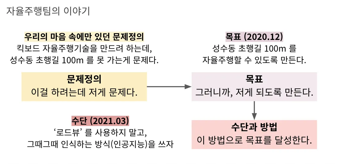 문제정의는 “무엇무엇을 하는 데 무엇무엇이 문제다” 와 같은 꼴이 되어야 해. 그러니까, 당시 디어 자율주행팀의 문제정의는 “킥보드 자율주행기술을 만드려 하는데, 성수동 초행길 100m 를 못 가는게 문제다.” 가 되겠지? 이 문제정의는 말도 안되는 문제정의야.