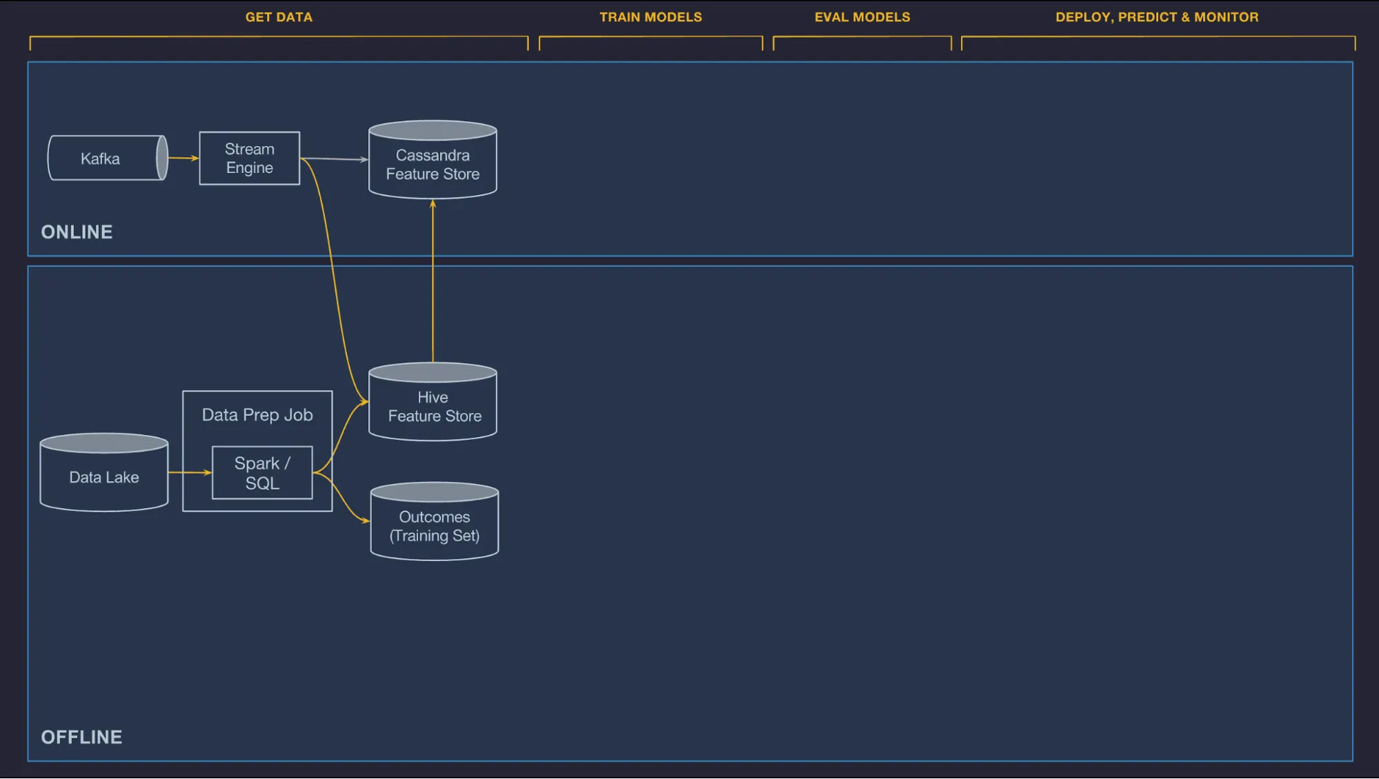 예를 들어 원시 데이터로부터 (1)우버를 호출할 것으로 예상되는 고객의 위치, (2)그 당시 근처 우버 운전자의 위치, (3)고객과 우버 운전자의 매칭 여부가 10분간 1분 단위로 상대적 위치를 계산한 10차원 데이터(x)와 정답값(y)로 변환된 후 미켈란젤로의 피처 저장소에 자동으로 적재되는 ETL 파이프라인이 있다고 생각해 보자. 데이터 과학자들은 모델을 학습시키고자 할 때 전처리에 대한 큰 고민 없이 피처 저장소에 잘 정제된 데이터를 꺼내서 사용하기만 하면 될 것이다.