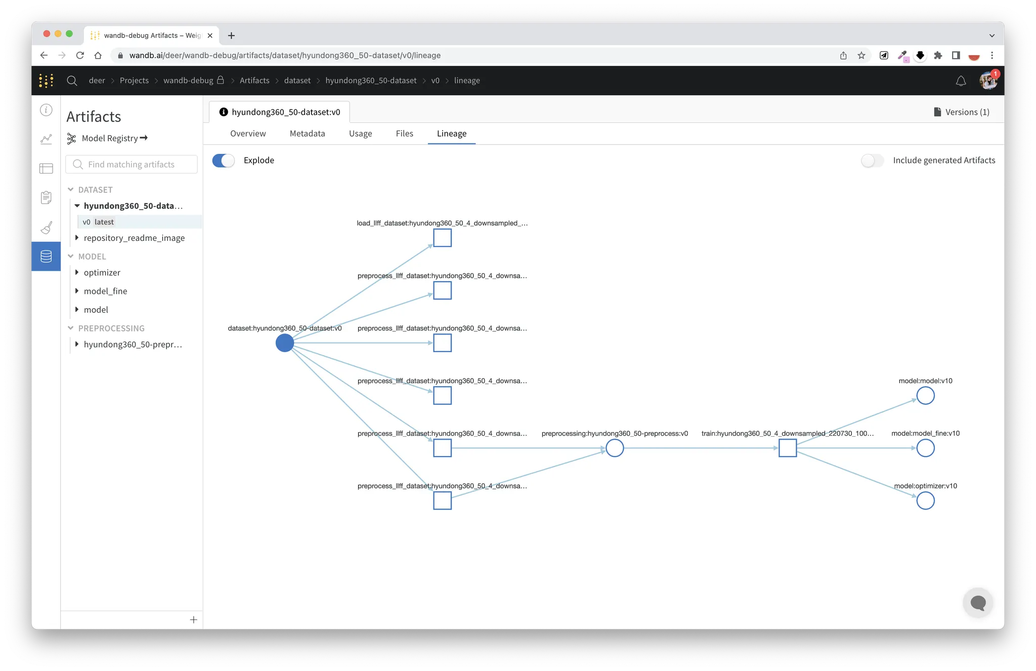 이때, 일부 정보만 a = wandb.init() a.log_artifact(a_artifact) 를 통해 업로드한 아티팩트 객체 a_artifact 를 a.log_artifact(a_artifact) 를 이용해서 업로드하고, b = wandb.init() 을 통해 얻은 객체 b 에서 b.use_artifact(a_artifact) 를 사용하면 DAG 를 만들어줄 수 있다.