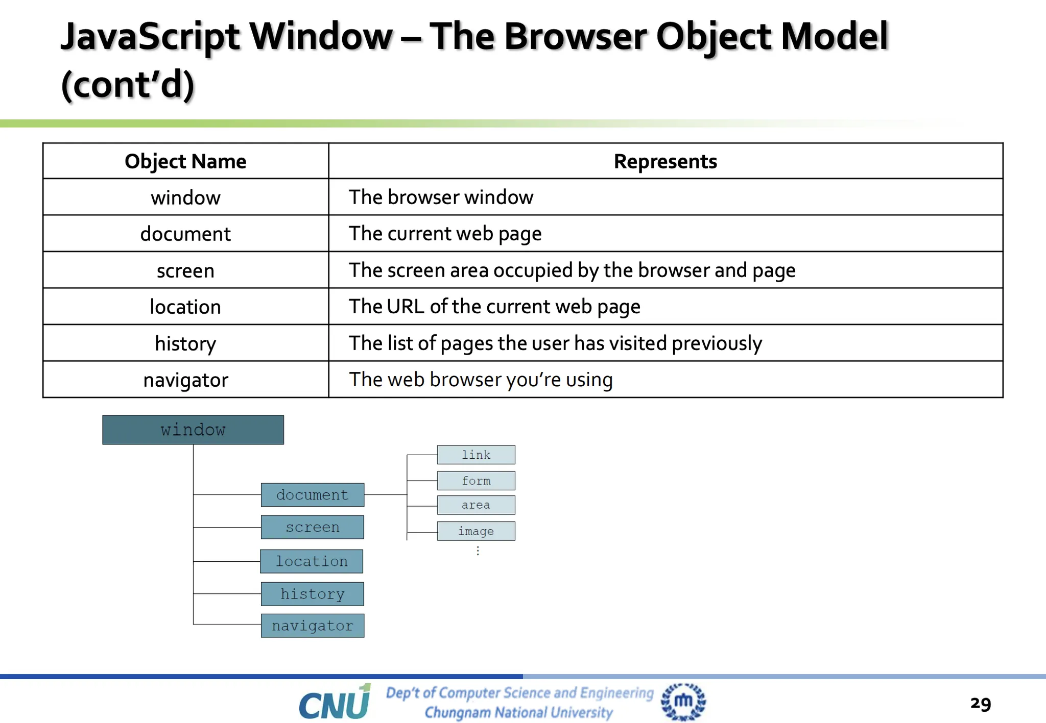 Browser object model (BOM))이 있다고 생각하는 것이 편하다. BOM은 브라우저 각 요소를 어떻게 객체로 표현할 것인가를 다룬다. 브라우저의 객체를 제어할 프로그래밍 언어의 객체에 브라우저 객체를 연결해 사용하는 것이다. 자바스크립트같은 언어에 종속되지 않는다는 것이다(참고1:파이썬 DOM API).