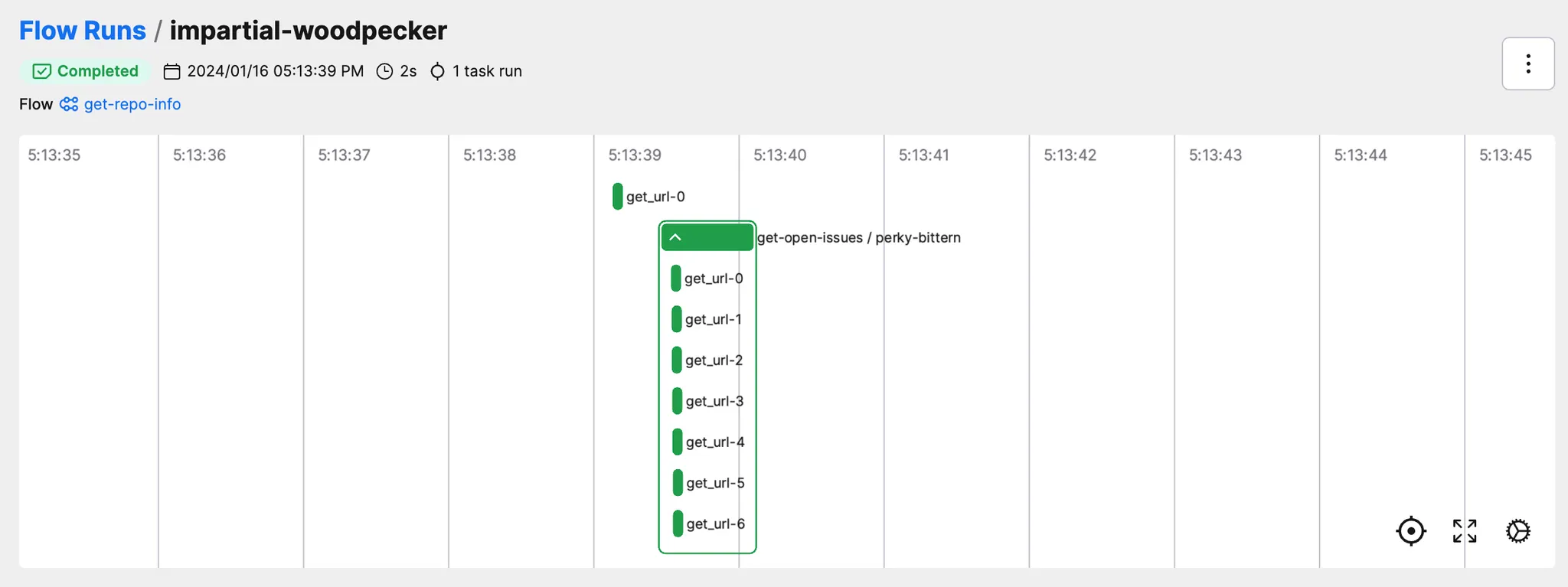 서브플로우(subflow): @flow데코레이팅된 함수가 @flow데코레이팅된 또다른 함수를 호출하는 것도 가능하다. 네스팅된 플로우가 실행되는 경우 웹 콘솔에 아래와 같이 시각화된다.