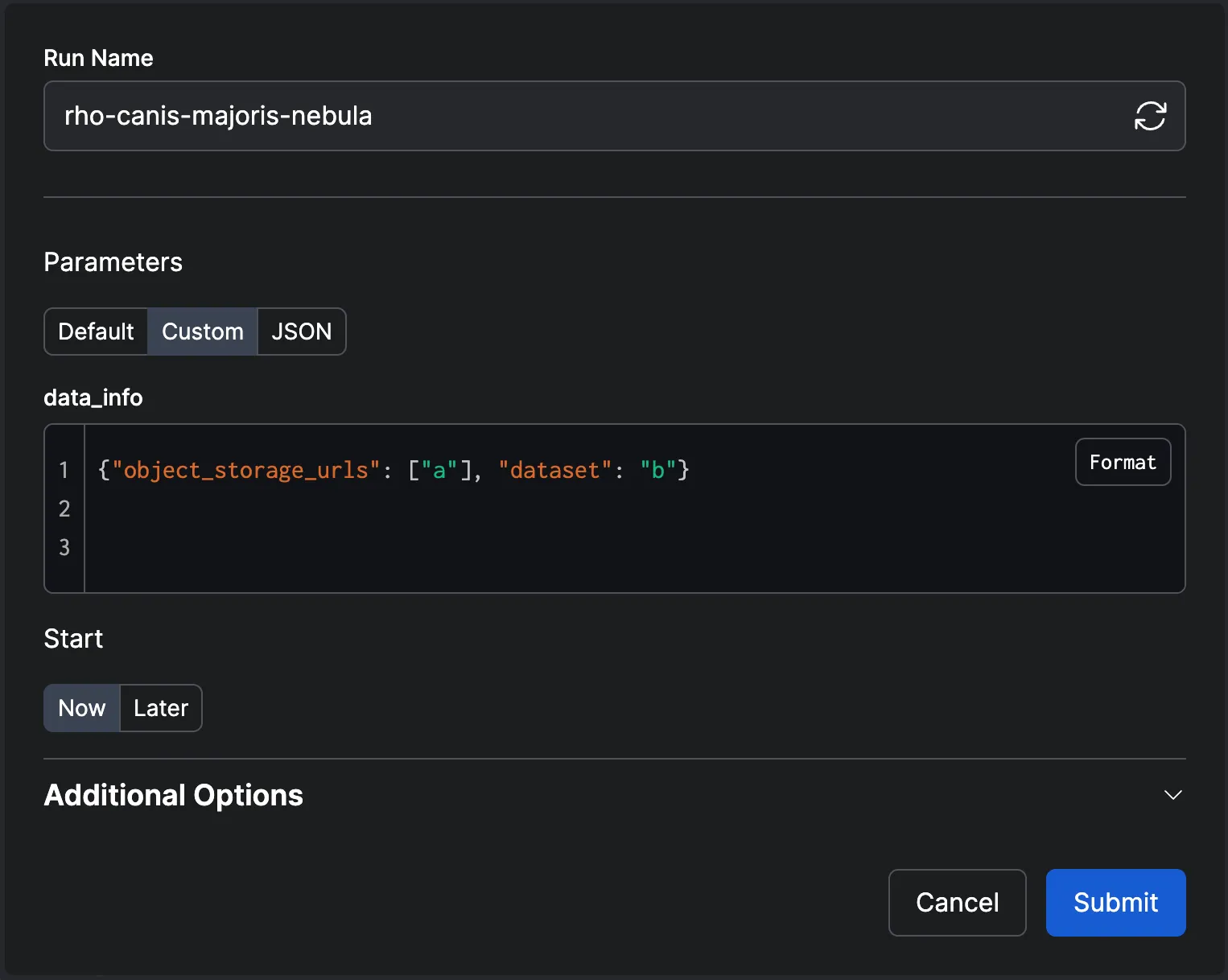 prefect deployment run server-flow/MyPrefectDeployer --param data_info='{"object_storage_urls": ["a"], "dataset": "b"}'