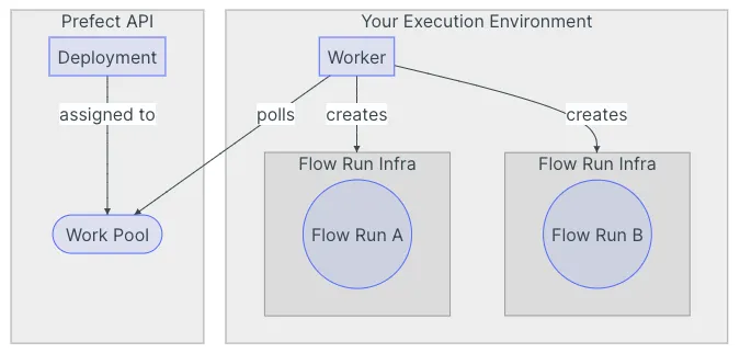 심부름꾼(worker, (구) agent): 일거리 풀에 쌓여 있는 일거리들을 점검(polling)하고, 환경을 준비하고, 실행시키는 일까지, 심부름을 담당하는 가벼운 프로세스다. prefect worker start --pool example-pool 명령으로 심부름꾼을 고용할 수 있다. 고용된 심부름꾼도 무한루프에 빠져 요청을 대기한다. (task를 ‘작업’으로 번역했으므로, 중복을 피하기 위해 work을 ‘일거리’, worker을 ‘심부름꾼’로 번역한다.)