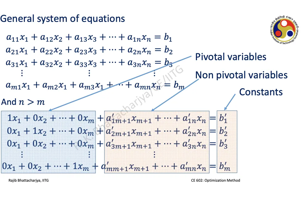 이렇게 n변수 방정식을 풀어내는 상황을 잘 일반화해 보면 방정식 앞부분에는 저렇게 잘 소거되는 변수들이 있을것이고 뒷쪽에는 변수들이 다 살아있을텐데 이것을 Pivotal, non pivotal 이라고 부르는 것 같다. 여기서 잘 보면 변수가 n 개이고 식이 m 개이다.