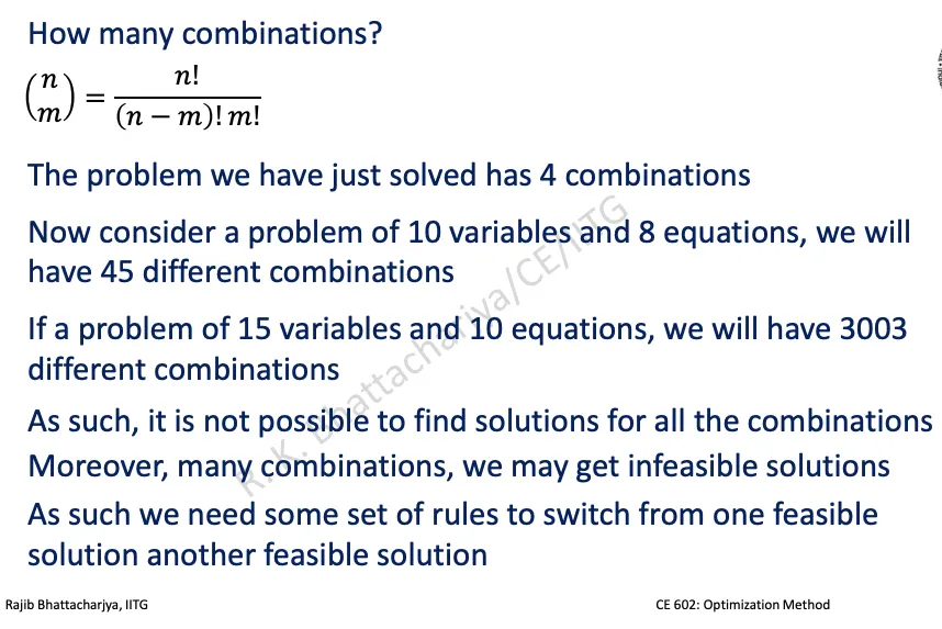 변수의 개수를 n 개, 주어진 등식 (조건이 아니다! 부등식인 순간 변수가 늘어나게 된다!) 의 수를 m 개라고 했을 때 nCm 개의 basic solution 이 나올 수 있게 된다.