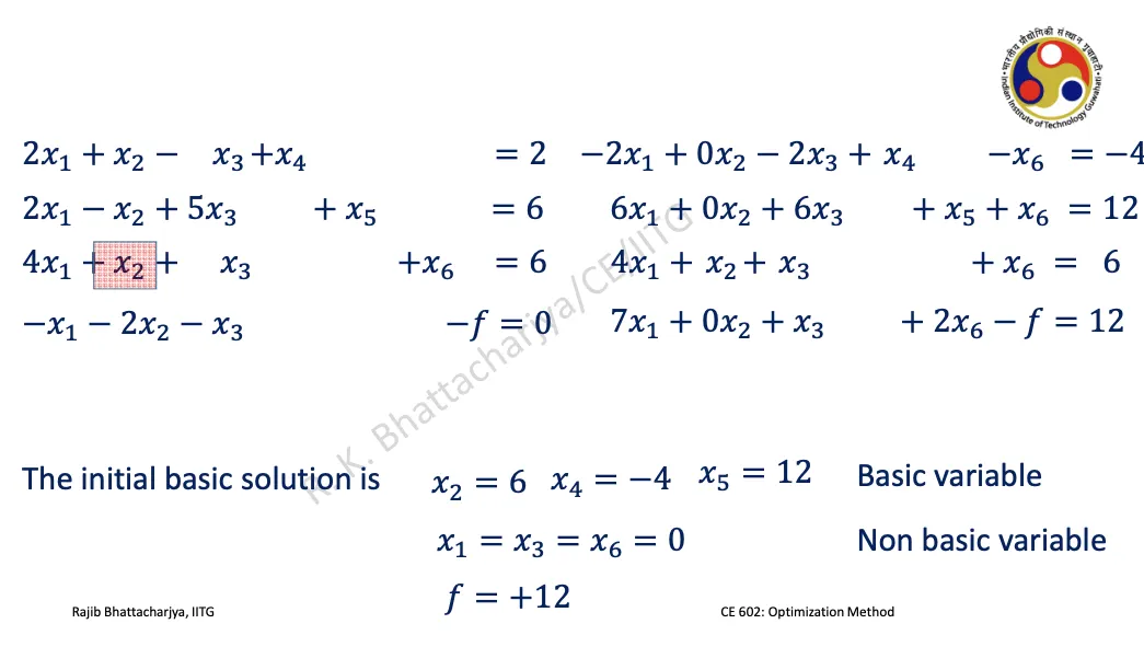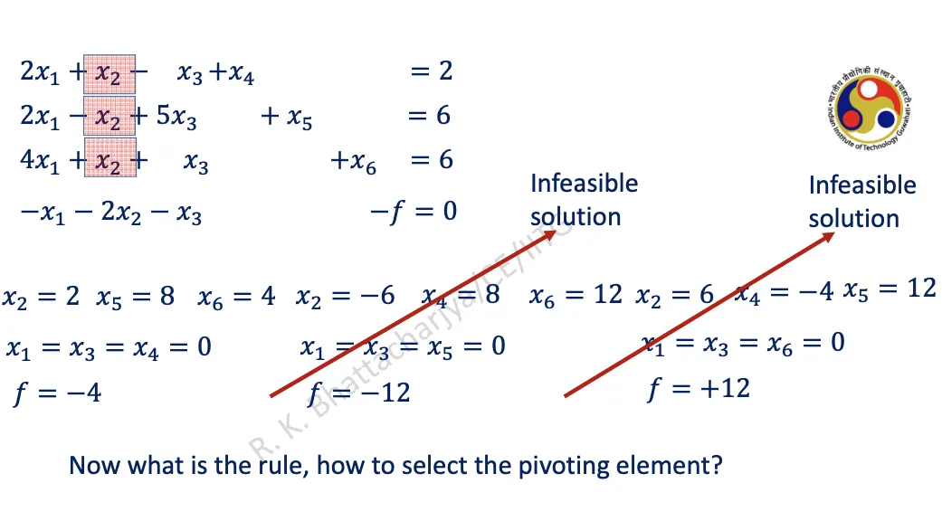 여튼, pivot 을 잘못 잡으면, 마지막에 이게 유효한지 아닌지 확인을 하게 되어 비효율적이다. 이것을 어떻게 더 잘 할 수 있을까? 어떻게 더 효율적으로 pivot 을 잡고 연산해서 해를 구할 수 있을까? 를 고민하면서 나온 것이 Now what is the rule, how to select the pivoting element? Select the minimum one to avoid infeasible solution Thus the general rule is "Select the minimum one to avoid infeasible solution" ... SIMPLEX METHOD 인 것 같다. 이에 대해서는 추가적인 공부가 필요하다.