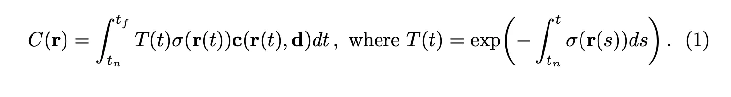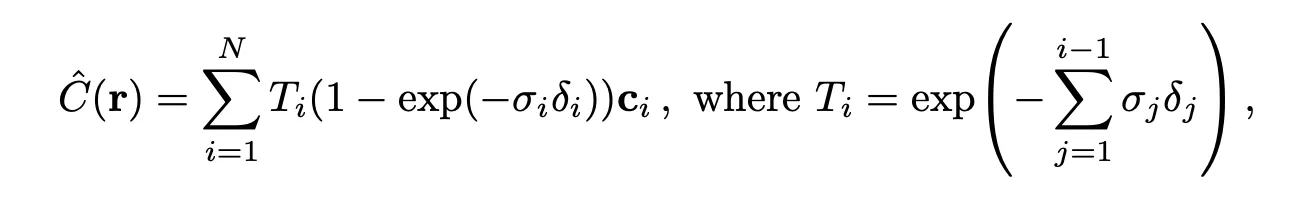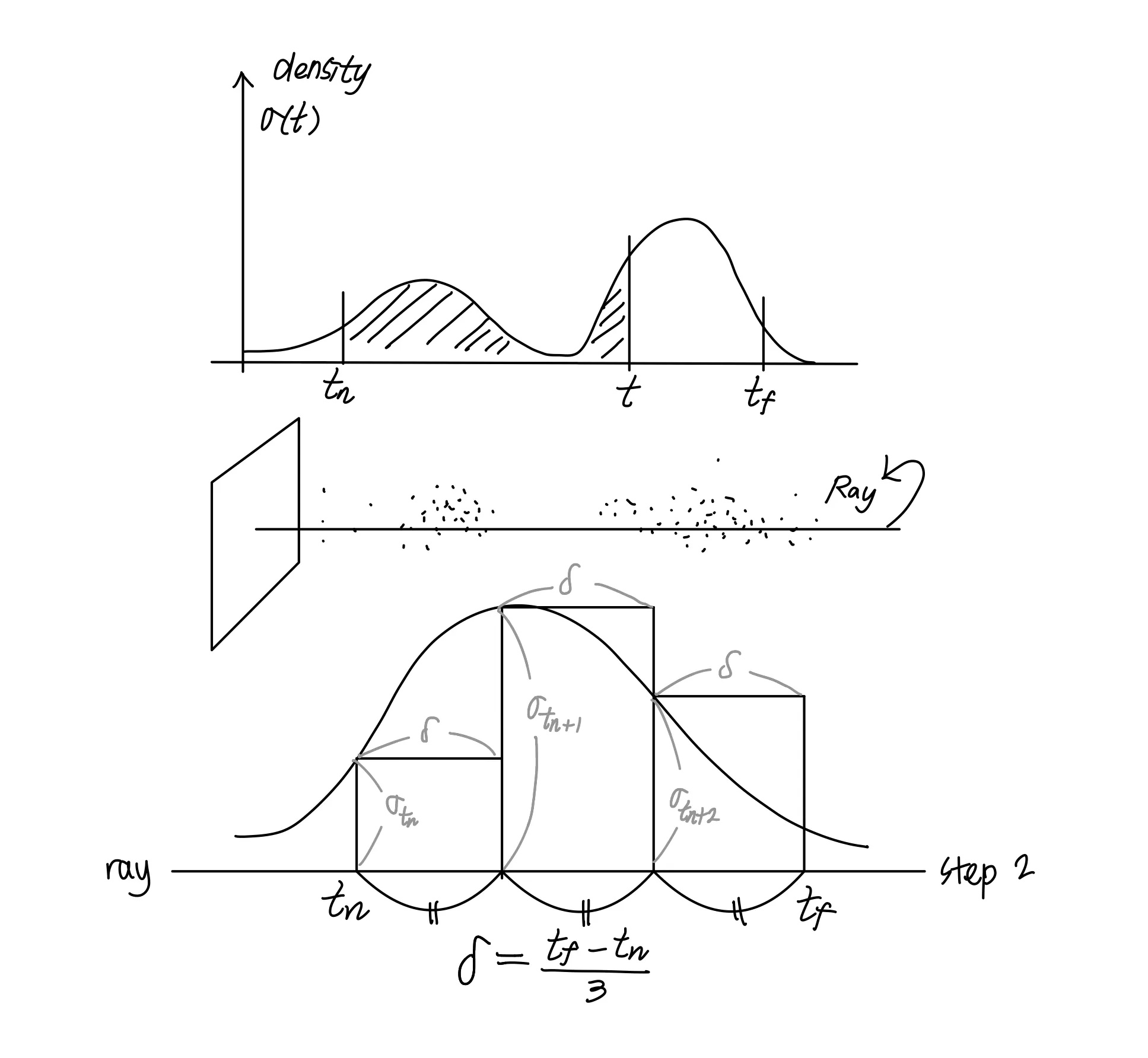이렇게 구적법(quadrature)으로 연속이 전제된 Ray 정의식을 이산적으로 표현한다. 이 식은 구적법의 각 구간(delta)길이가 다른 경우에 대해 일반화되어 있다.