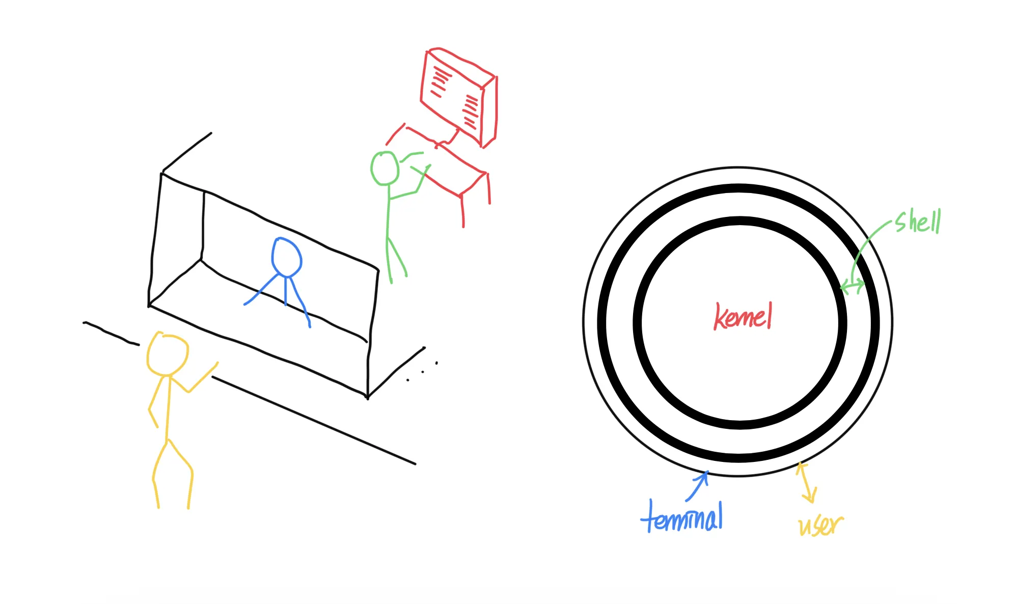 터미널(Terminal)은 마우스 없이 키보드만을 이용해서 컴퓨터를 제어하는 소프트웨어이다. 커널(Kernel)은 하드웨어를 제어하는 계층을 의미한다. 셸(Shell)은 단어 그 자체로 ‘껍데기’ 를 의미하며, 사람이 이해하기 쉬운 형태의 명령을 들고 커널이 이해할 수 있는 방식으로 전달한다.