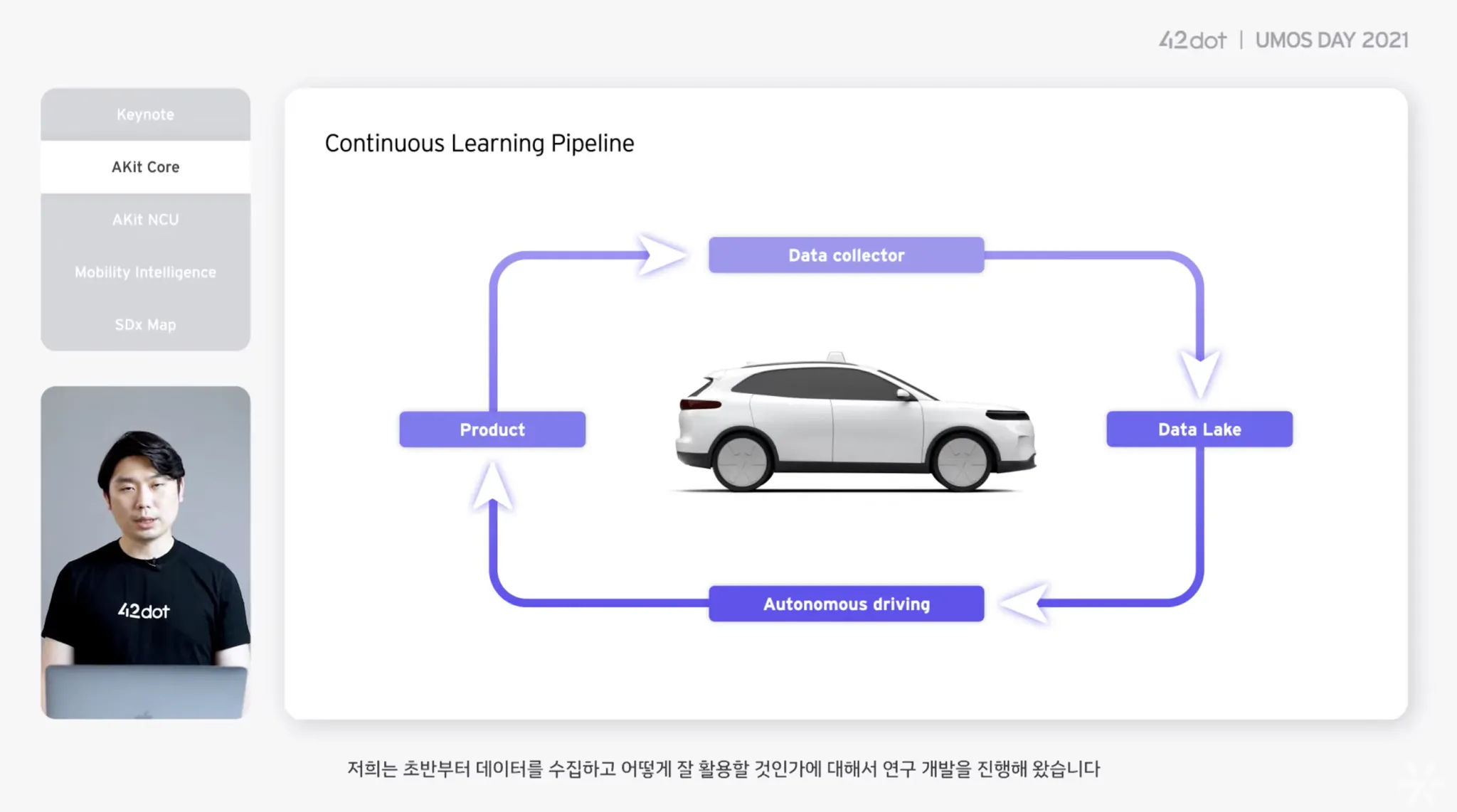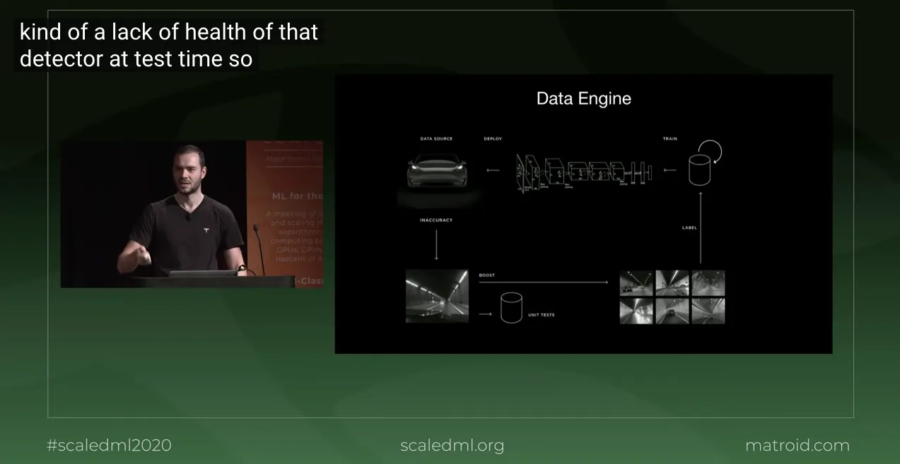 카메라만 사용한다는 확장성 면에서는 테슬라와 포티투닷이 단연 압권이다. 실제로 포티투닷은 UMOS Day 2021 에서 'Continuous Learning Pipeline' 이라는 이름으로 피드백 루프(참고7) 구성 개요를 흘려 주었다. 실제로 Product 가 곧장 Data collector 가 되는 구조라는 것을 볼 수 있다 (참고6). 테슬라는 포티투닷보다 조금 더 많은 내용을 공개했는데 이 글에서 말하고자 하는 핵심은 '데이터 엔진' 으로부터 들어오는 데이터는 실제 서비스 중인 차량으로부터 들어오게 된다는 것이다 (참고10).