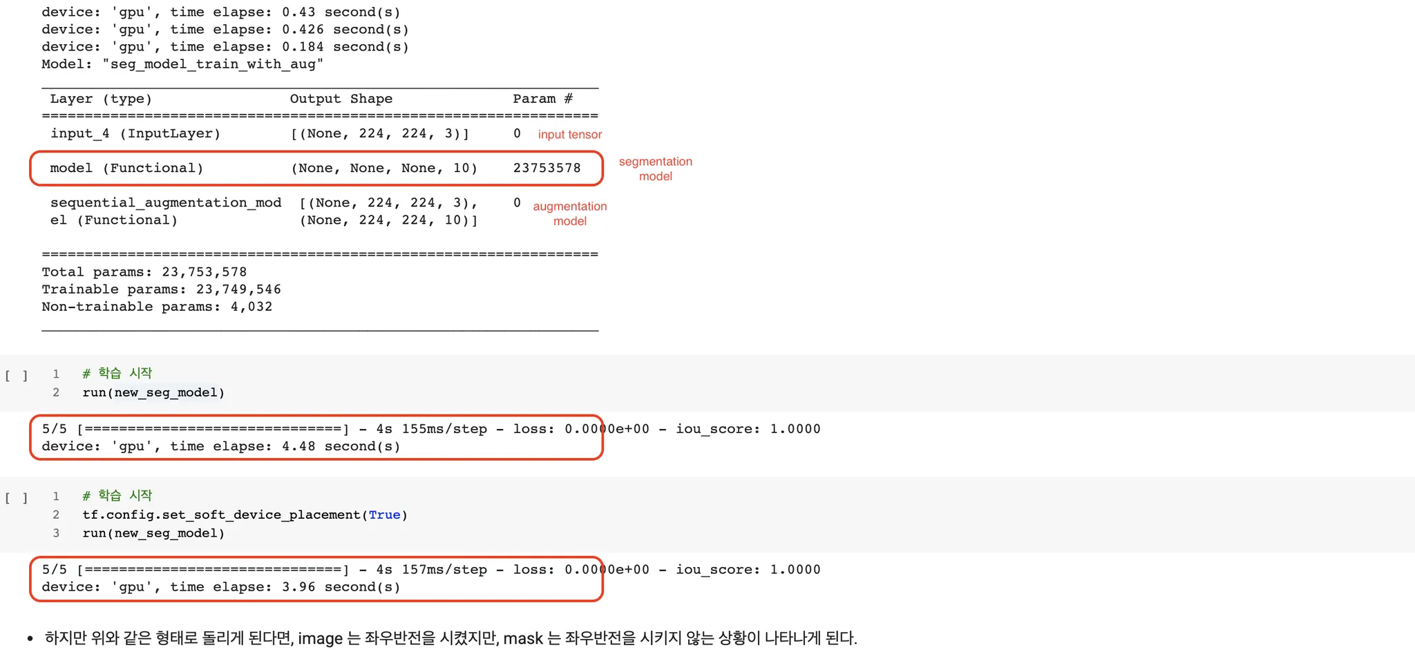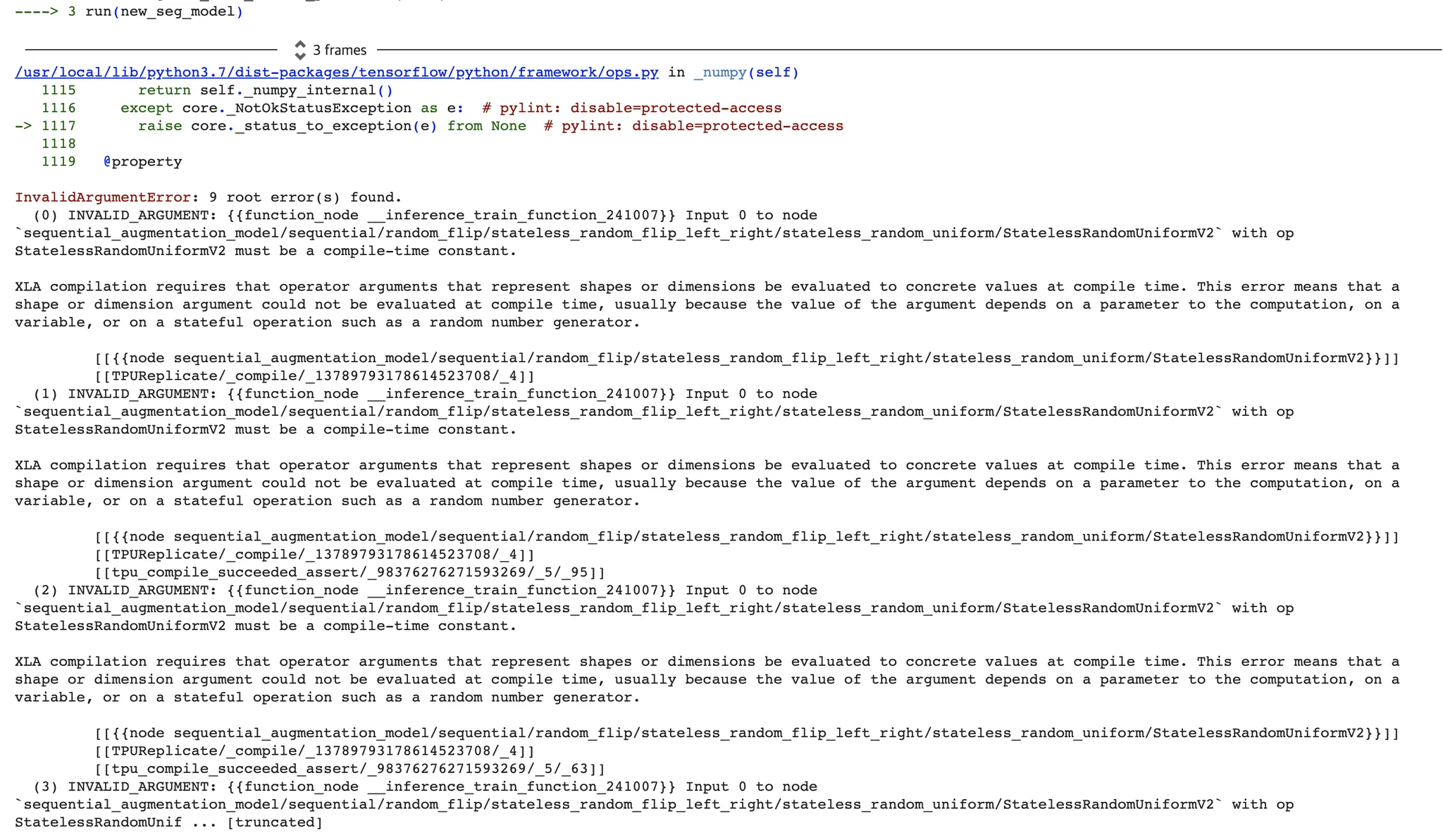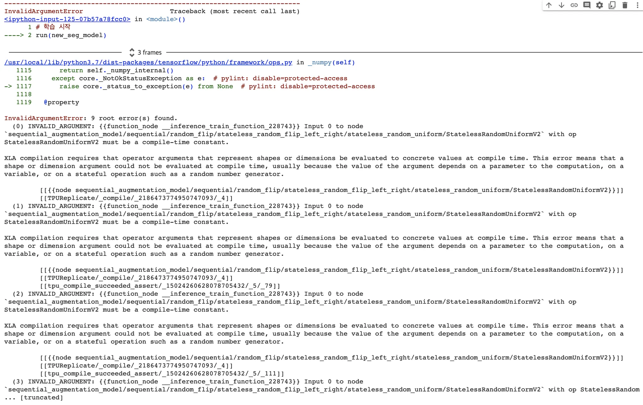 짐작하건데 무작위(Random) 기반의 augmentation 이기 때문에, 이렇게 train_step() 과 같은 구성에서 TPU 에서 올바르게 작동시킬 수 없다. 즉석 환경 에서 call 하는 것이 불가능한 것이라고 생각한다. 내용을 대충 보면, 랜덤 숫자를 생성하는 과정에서 문제가 생겼고, 이를 해결하기 위해서는 "compile-time constant" 가 되어야 한다고 하는데, 관련 이슈를 겪고 있는 사람을 많이 찾을 수 없었다.