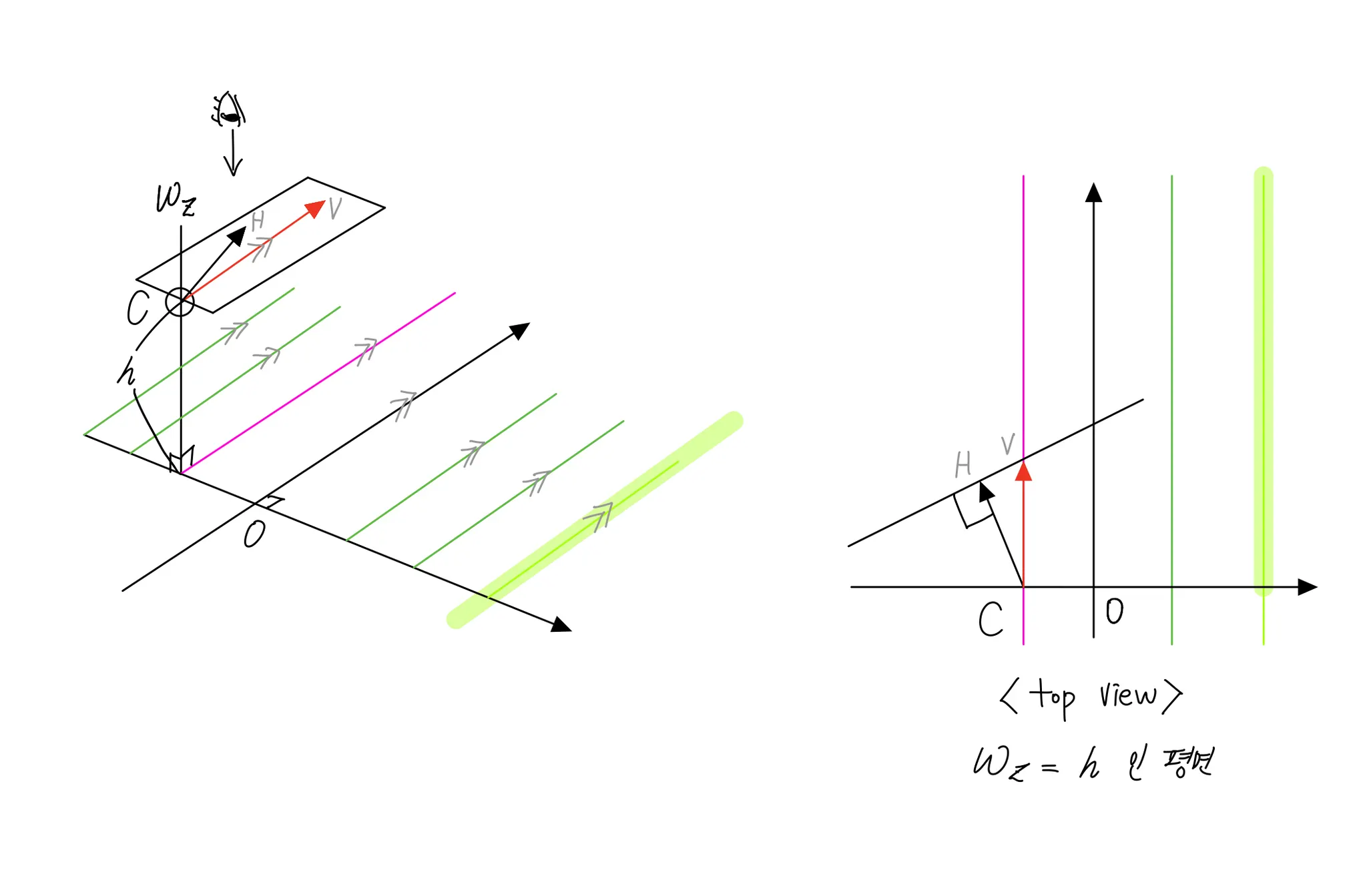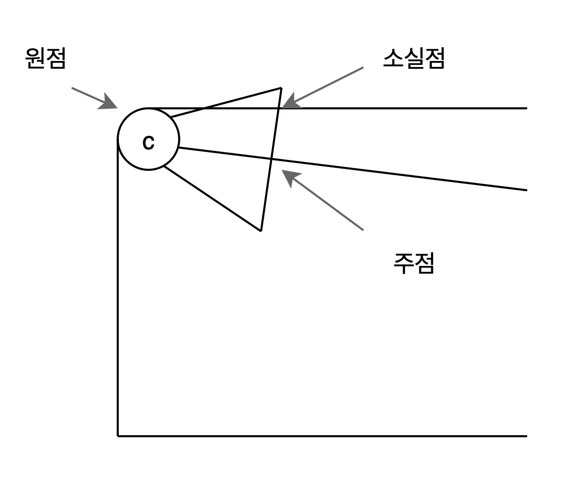 오른쪽 그림과 같이 위( ) 를 잘라 보았을 때(top view), 이미지 평면과의 교선이 바로 소실선이 된다.