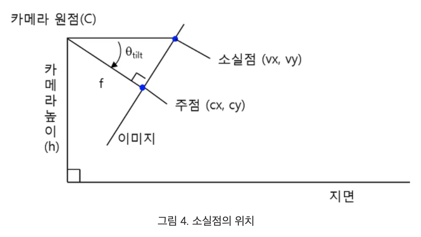 서로 다른 두 평면이 평행이더라도 2D 영상에서 동일한 소실선을 갖는다 (참고4). 그 이유는 소실점의 위치는 기하적으로 영상 소실점의 위치는 카메라 원점을 지나고 지면에 평행한 선이 이미지평면과 만나는 곳이기 때문이다 (참고6).