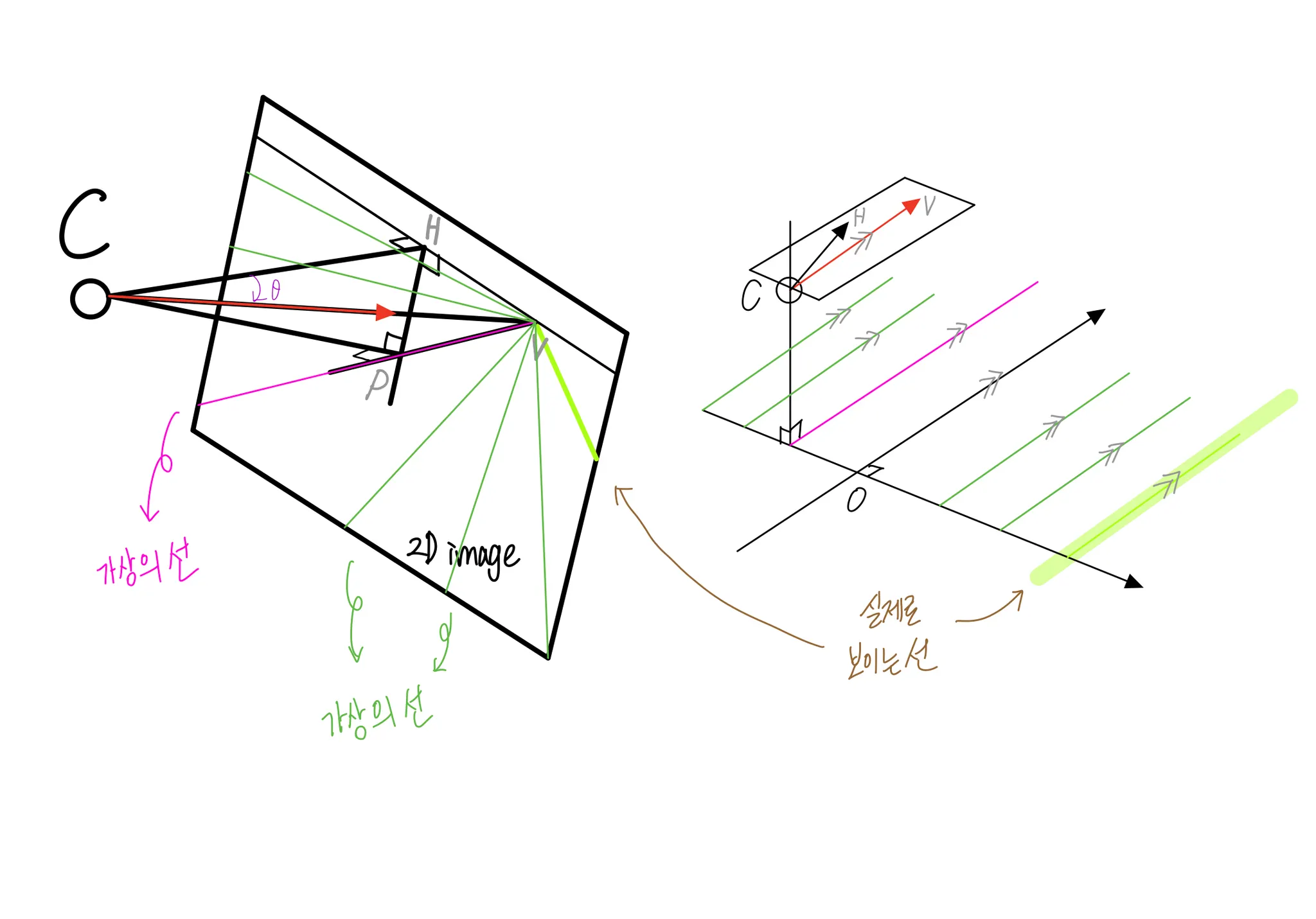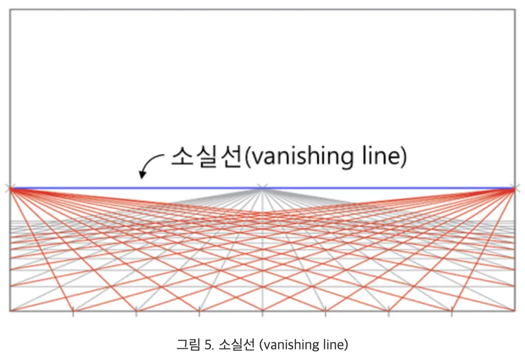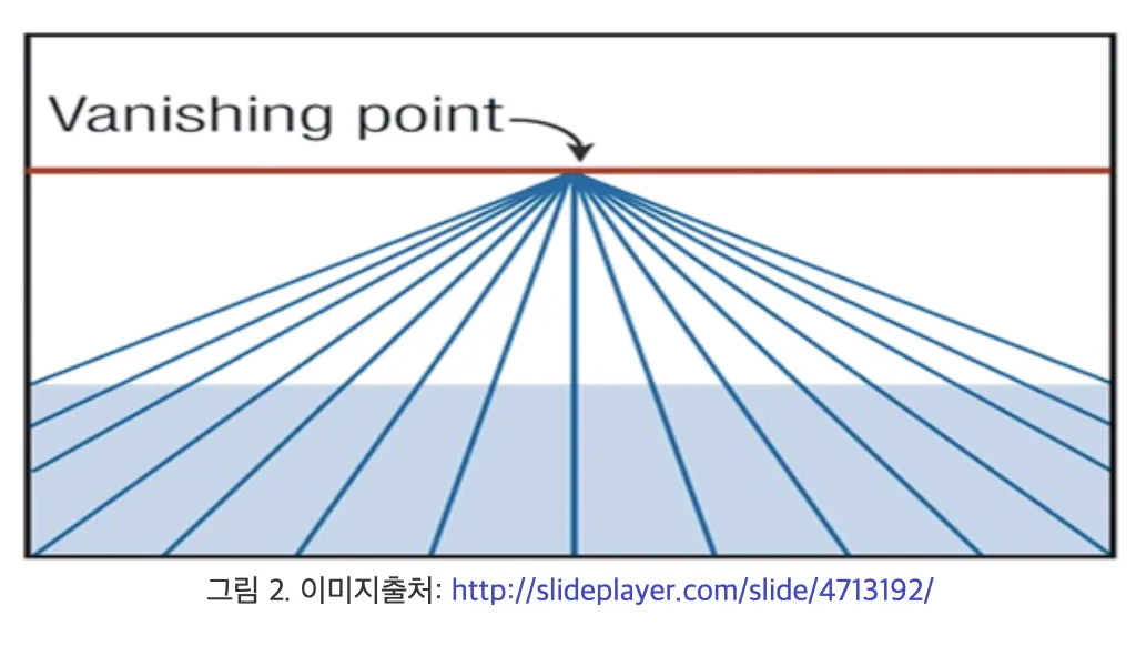 우리가 살아가는 3D 세상에서 평행한 직선이 2D 영상에 투영되어 원근효과에 의해 한 점에서 만나는 것처럼 보일 때 이를 소실점(vanishing point) 이라고 부른다 (참고1). 평행하지 않은 직선들은 다른 소실점을 갖는다. 같은 평면 위 직선들의 소실점들은 모두 일직선상에 존재하게 되는데. 이를 소실선이라고 한다 (참고5).