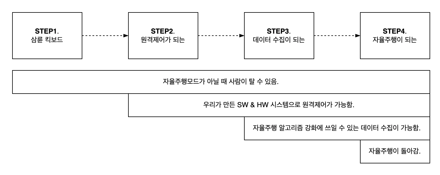 자율주행팀이 만들어낼 기술이 ‘5년 뒤에 완성될 것이다’ 라고 여기는 경영진의 태도를 지적하고, 자율주행팀이 궁극적으로 하고자 하는 일까지 가는 길을 네 단계로 잘게 나누어 제시했습니다. 지금 자율주행팀이 하고 있는 일이 네 단계 중 어떤 단계에 기여를 하고 있는 것인지 판단할 수 있는 기준이 되었습니다.