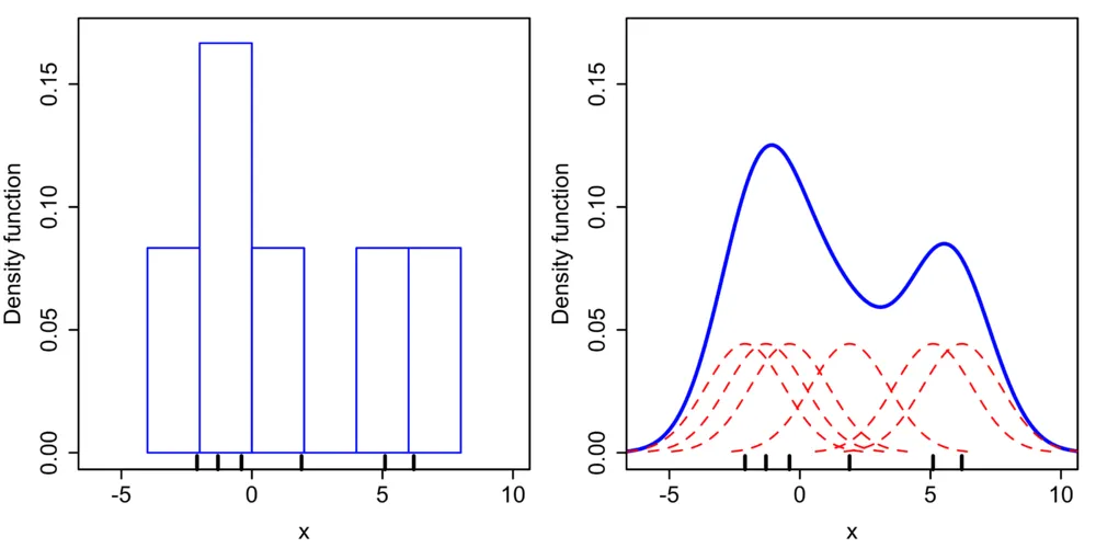 그런데 나는 저렇게 삐죽거리는 히스토그램이 딱히 마음에 들지 않는다. 아무리 훌륭하게 구간을 나누어도, 구간의 경계에서 불연속성을 띤다. 히스토그램이 이렇게 삐죽거릴수밖에 없는 이유의 본질에는 자연에서 추출해 관측한 데이터의 개수가 유한하기 때문이다. 이러한 히스토그램을 사용하지 않고 그림(ref2)의 오른쪽 파란색 그래프같이 연속 함수로 스무스하게 데이터를 표현하고 싶다면 어떻게 해야 할까?(ref6)