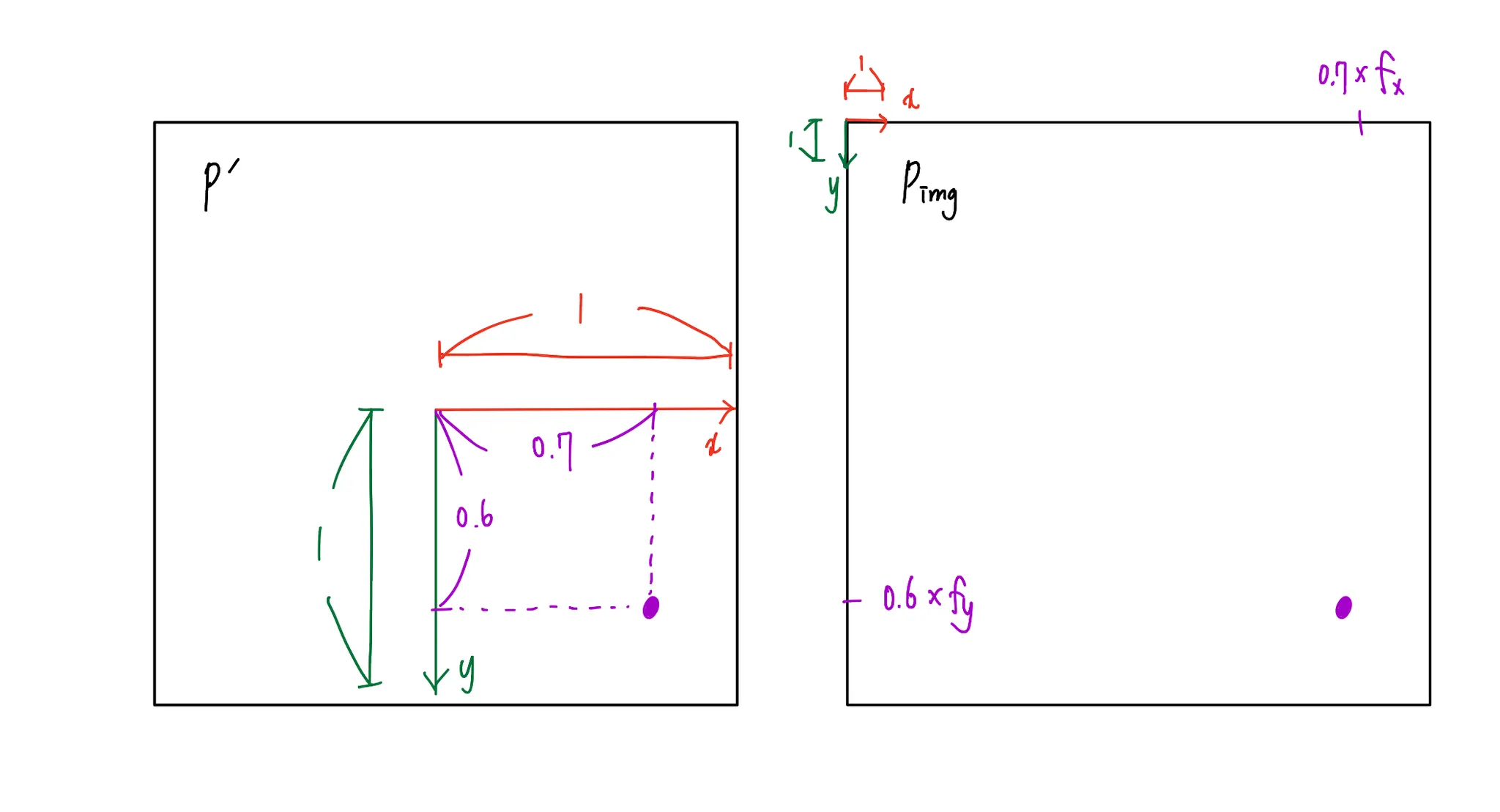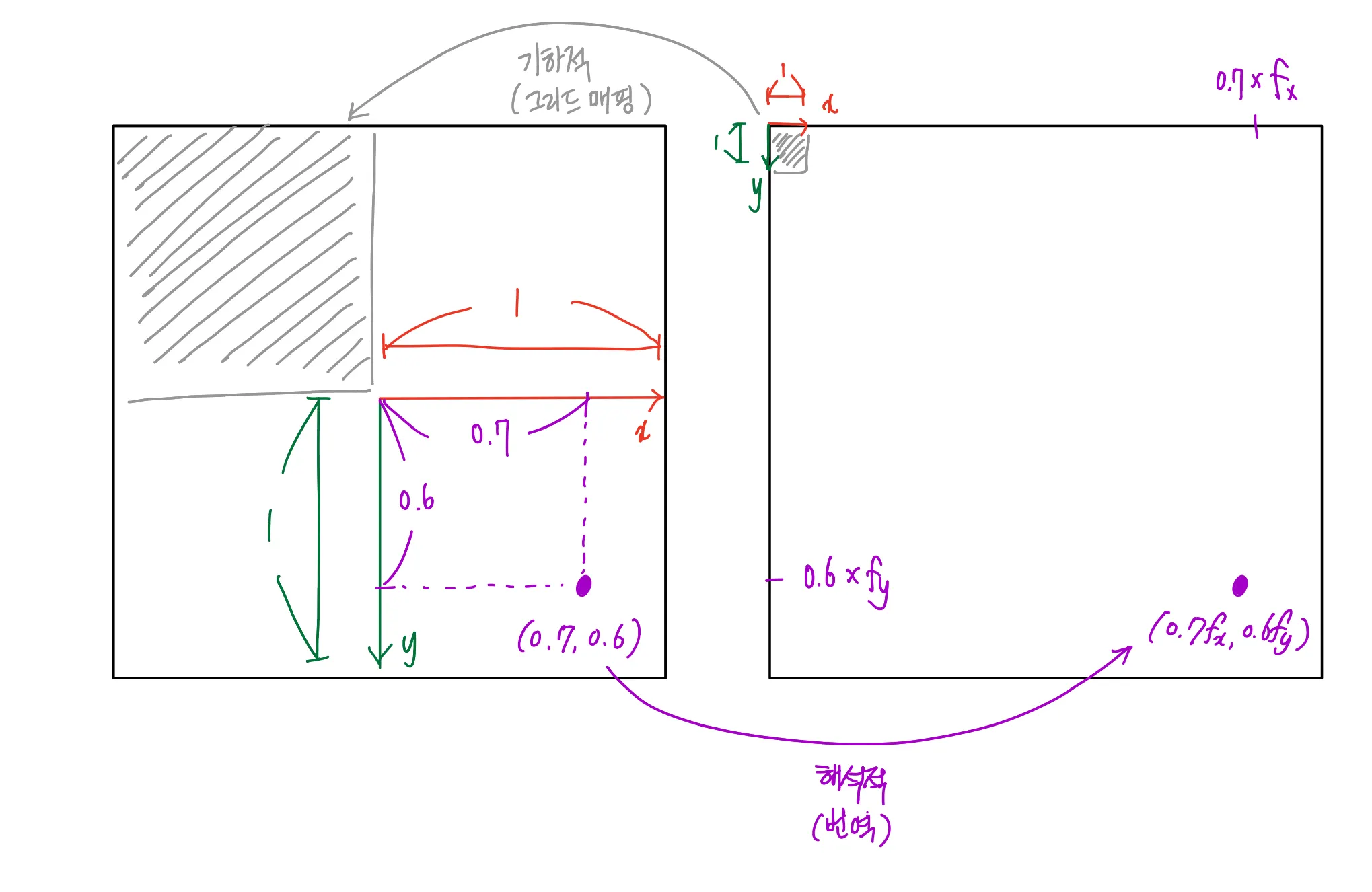 정규이미지좌표계의 단위벡터가 픽셀좌표계의 단위벡터보다 훨씬 더 길다. (그림에는 가 빠져 있다.)