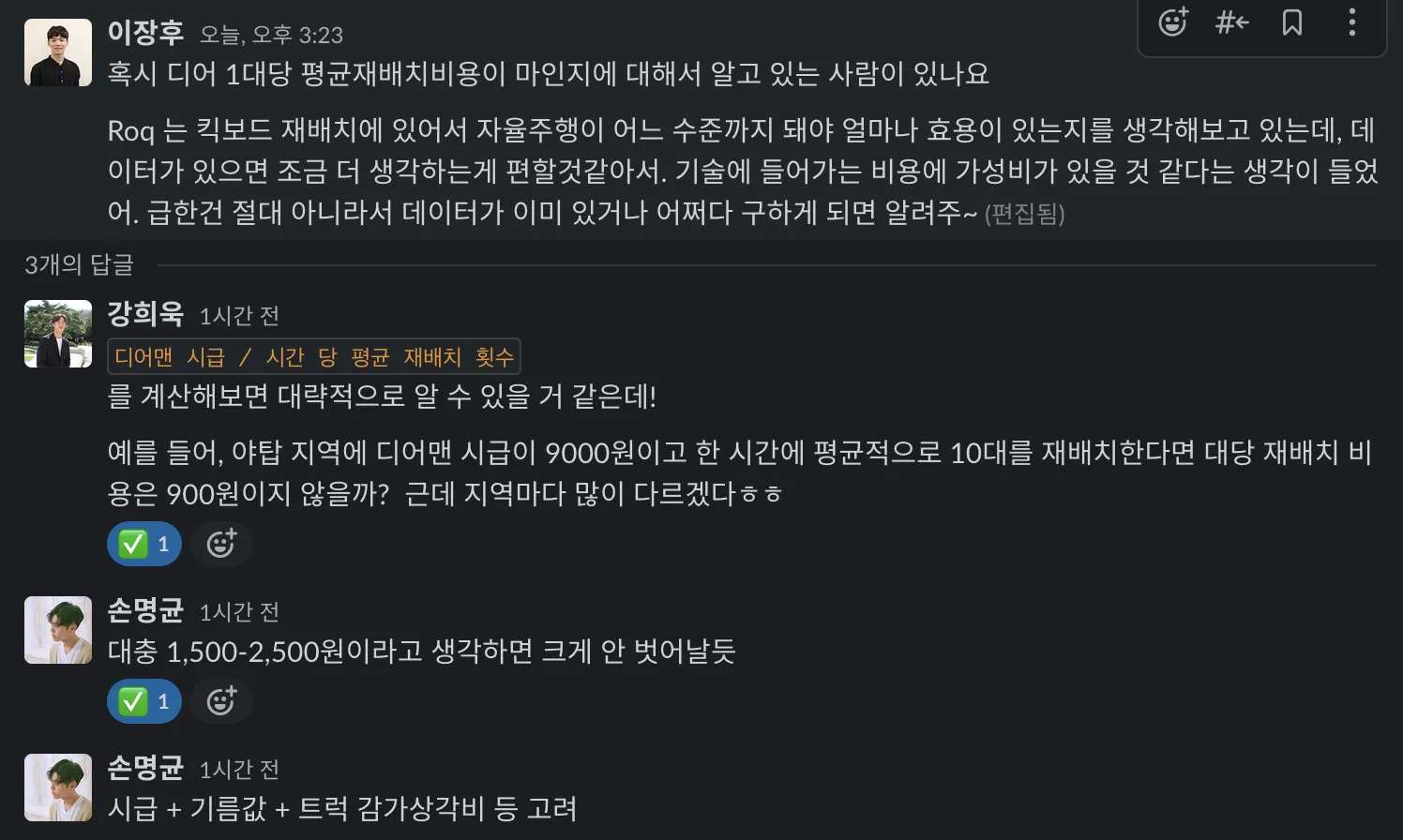 자율주행 킥보드를 개발함으로써 얻는 PR 효과를 모두 떼고, 자율주행 킥보드가 주는 운영 측면의 효용만을 생각해 보자. 자율주행 킥보드가 재배치 문제를 완벽하게 해결한다고 생각해 보자. 우선 어려운 가정 두 개가 들어갔다. (1) 자율주행 킥보드가 만들어짐. (2) 재배치 문제를 무인으로 완벽히 해결함. 만약 1일에 200대 재배치가 이루어지고, 디어 전체 킥보드가 수혜를 본다면 년 1억원의 수혜를 볼 수 있다. 1일에 1000 대 재배치가 이루어진다고 하더라도 1억정도의 수혜밖에 나오지 않는다. 하지만 이것은 (1) 에 필요한 기간과 폼팩터 교체에 들어가는 비용, (2) 를 개발하기 위한 비용을 고려했을 때 너무 너무 작은 수치이다. 중간다리가 필요하고, 자율주행 기술은 부분적으로 지원해야 한다. 이것은 세그웨이의 T60, T60 lite 모델에 대한 생각. 세그웨이는 어떻게 전동킥보드 자율주행을 만들어가고 있는가?‣ 의 접근과 비슷하다.