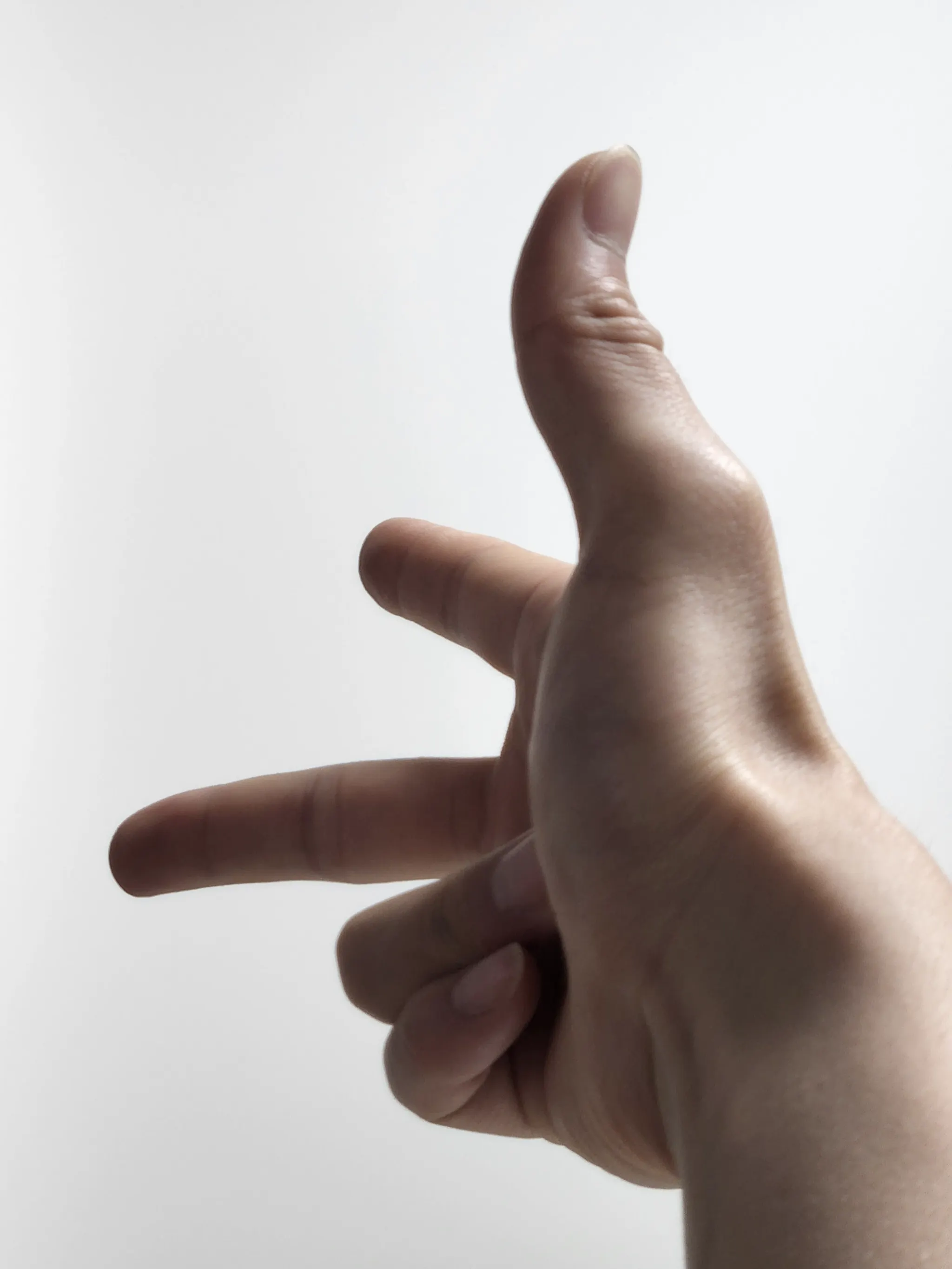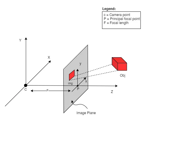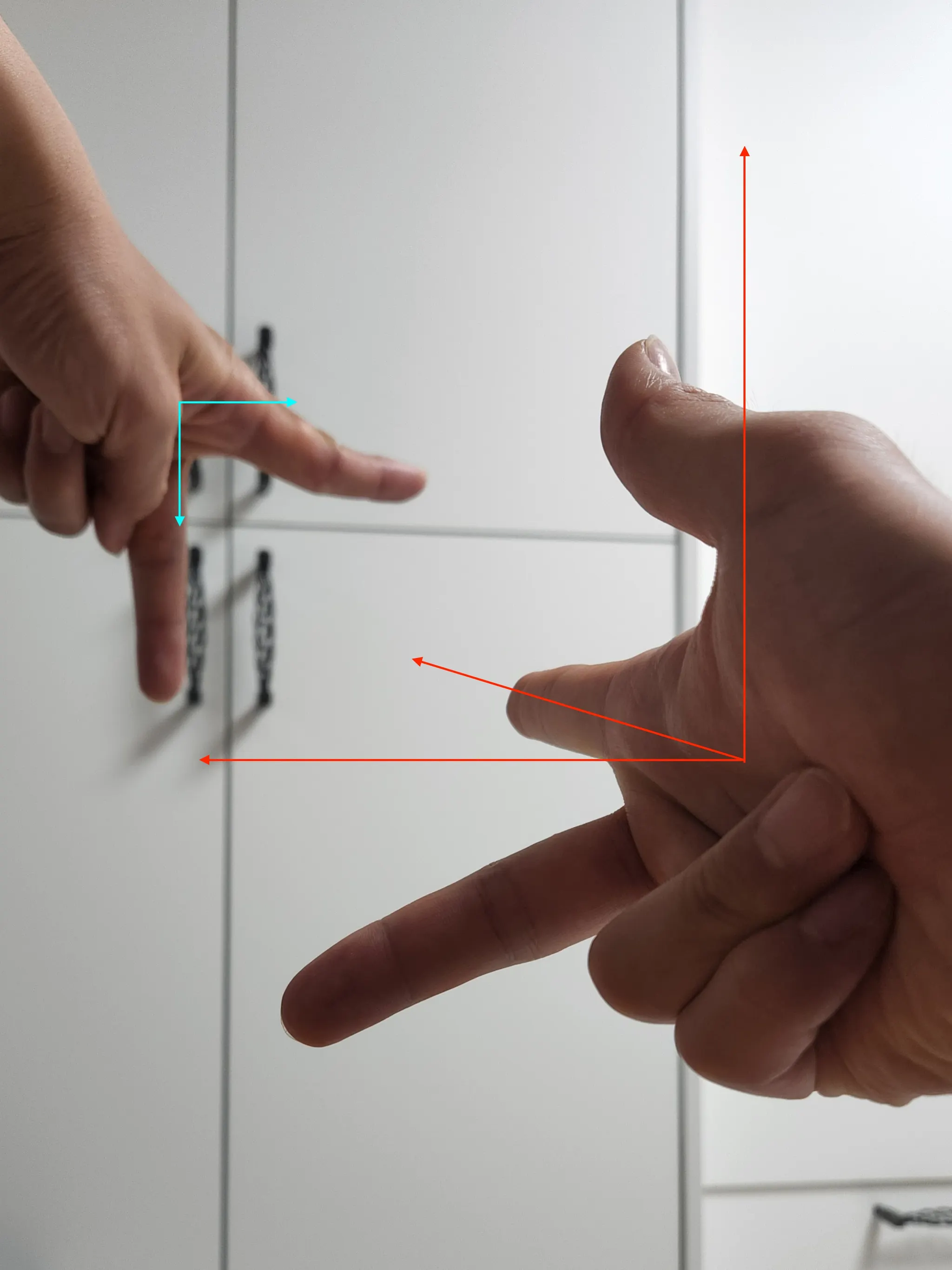 이번에는 조금 다르게 생긴 그림을 가져왔다. 그림을 보자. 위 그림에는 카메라 원점 좌표계, 이미지 좌표계가 그려져 있고, 카메라 정규 좌표계도 그려져 있다. 이 그림에 따르면, 카메라가 바라보는 방향이 이다. 그러니까 ‘전방’ 이다. 이번에는 왼손으로 위 그림의 좌표계를 표현해 보았다. 검지손가락을 나에게서 멀어지는 방향으로 두고 방향이라고 둔다면, 은 오른쪽 방향, 는 아랫쪽 방향이라고 할 수 있겠다.