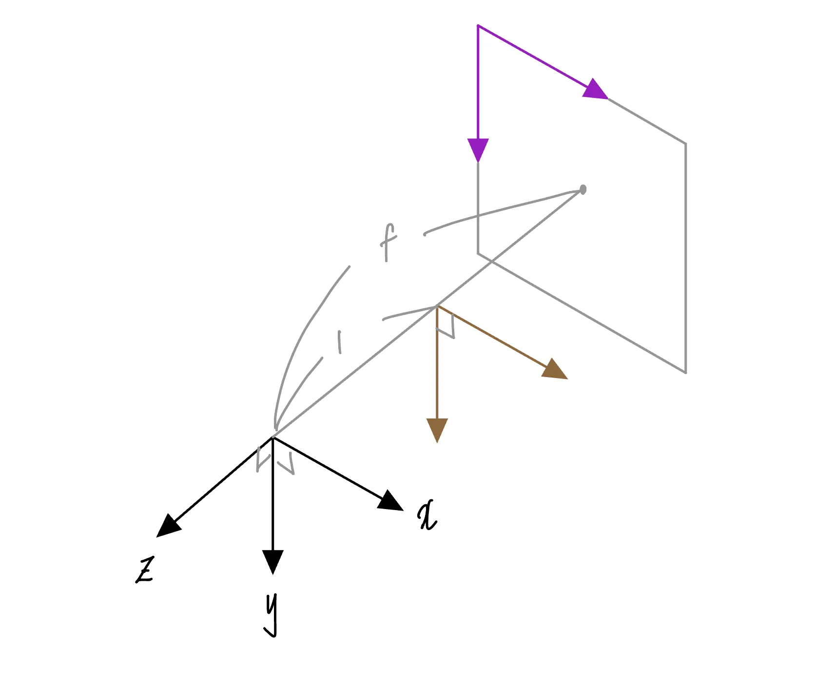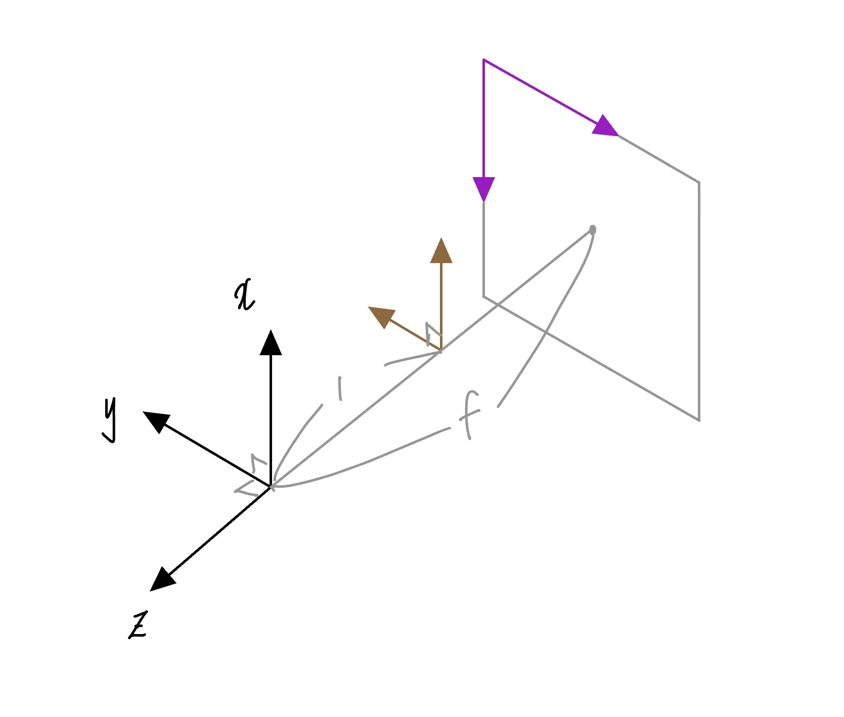 위 그림을 보자. 위 그림에는 카메라 원점 좌표계와 이미지 평면 그려져 있고, 카메라 정규 좌표계는 생략되어 있다. 이 그림에 따르면, 카메라가 바라보는 방향이 이다. 그러니까 ‘전방’ 이다. 오른손으로 위 그림의 좌표계를 표현해 보았다. 검지손가락을 나에게서 멀어지는 방향으로 두고 방향이라고 둔다면, 은 왼쪽 방향, 는 윗쪽 방향이라고 할 수 있겠다.
