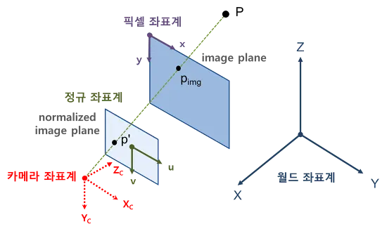 위 그림에는 카메라 원점 좌표계, 카메라 정규 좌표계, 이미지 좌표계가 그려져 있다. 마찬가지로, 카메라가 바라보는 방향이 이다. 그러니까 ‘후방’ 이다.