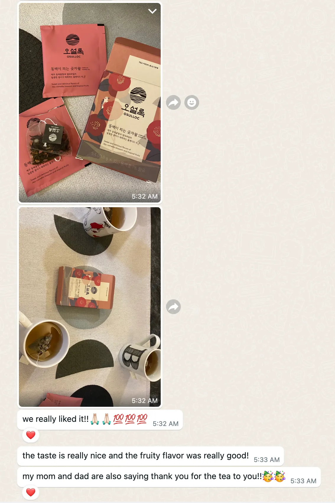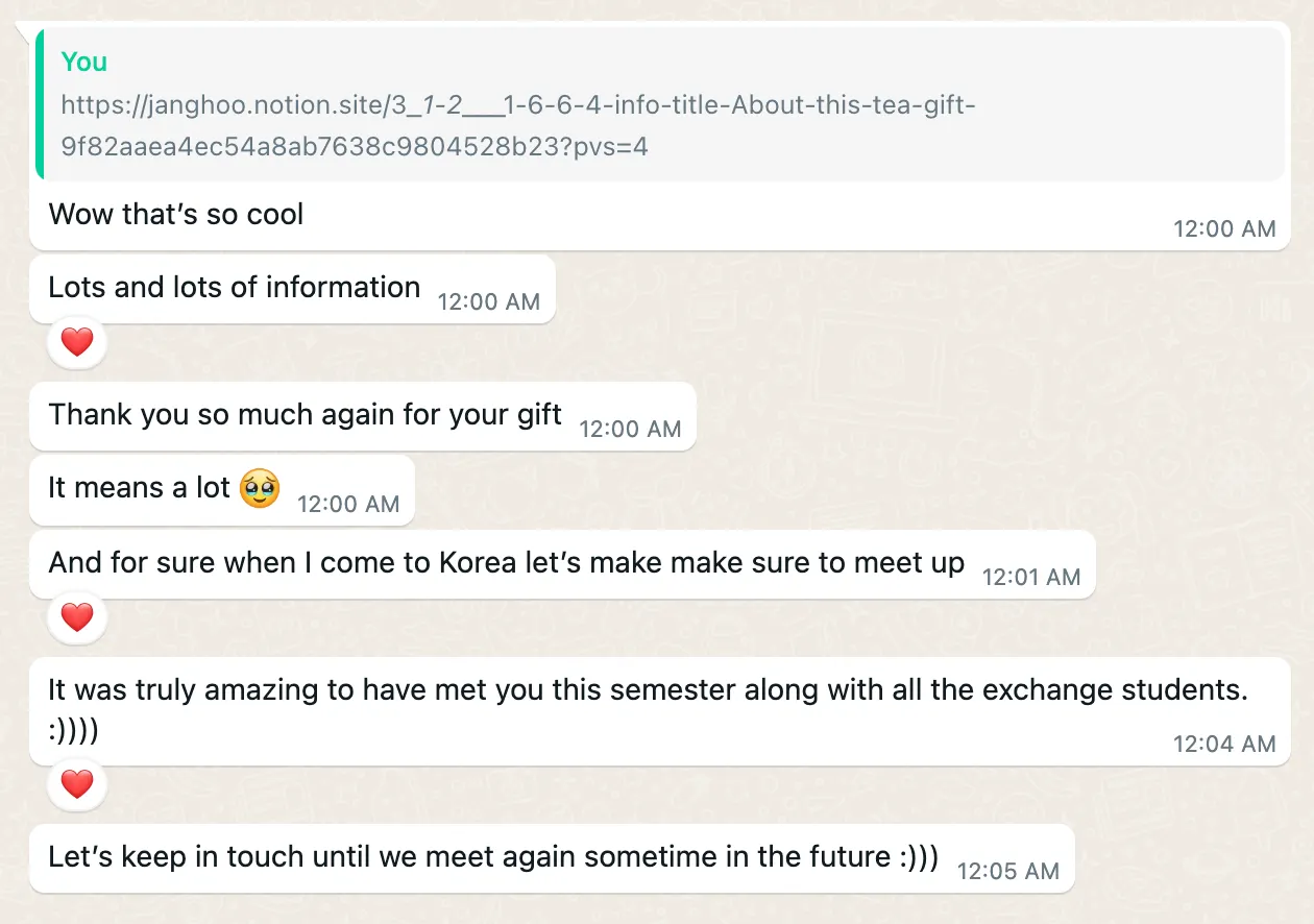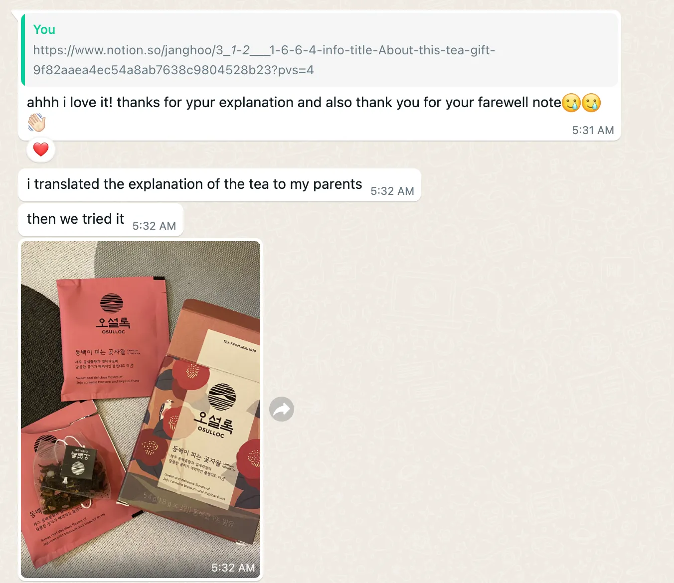한국에서 준비해 갔던 것은 오설록 프리미엄 티 4박스와 붉은 잉어가 잔 바닥에서 넘실거리는, 동양스럽고 예쁜 도자기 소주잔 3개, 안동소주 패키지를 구매했을 때 딸려 온 전통소주잔 1개였다. 오설록 차도 너무 좋은 선물이고, 도자기 소주잔보다 비싸기까지 하지만 한번 먹고 나면 모두 사라져 버린다는 문제가 있었다. 그래서 오설록 차를 선물한 경우 노션에 그 차에 대한 설명을 적어 문자로 보내 주었다.