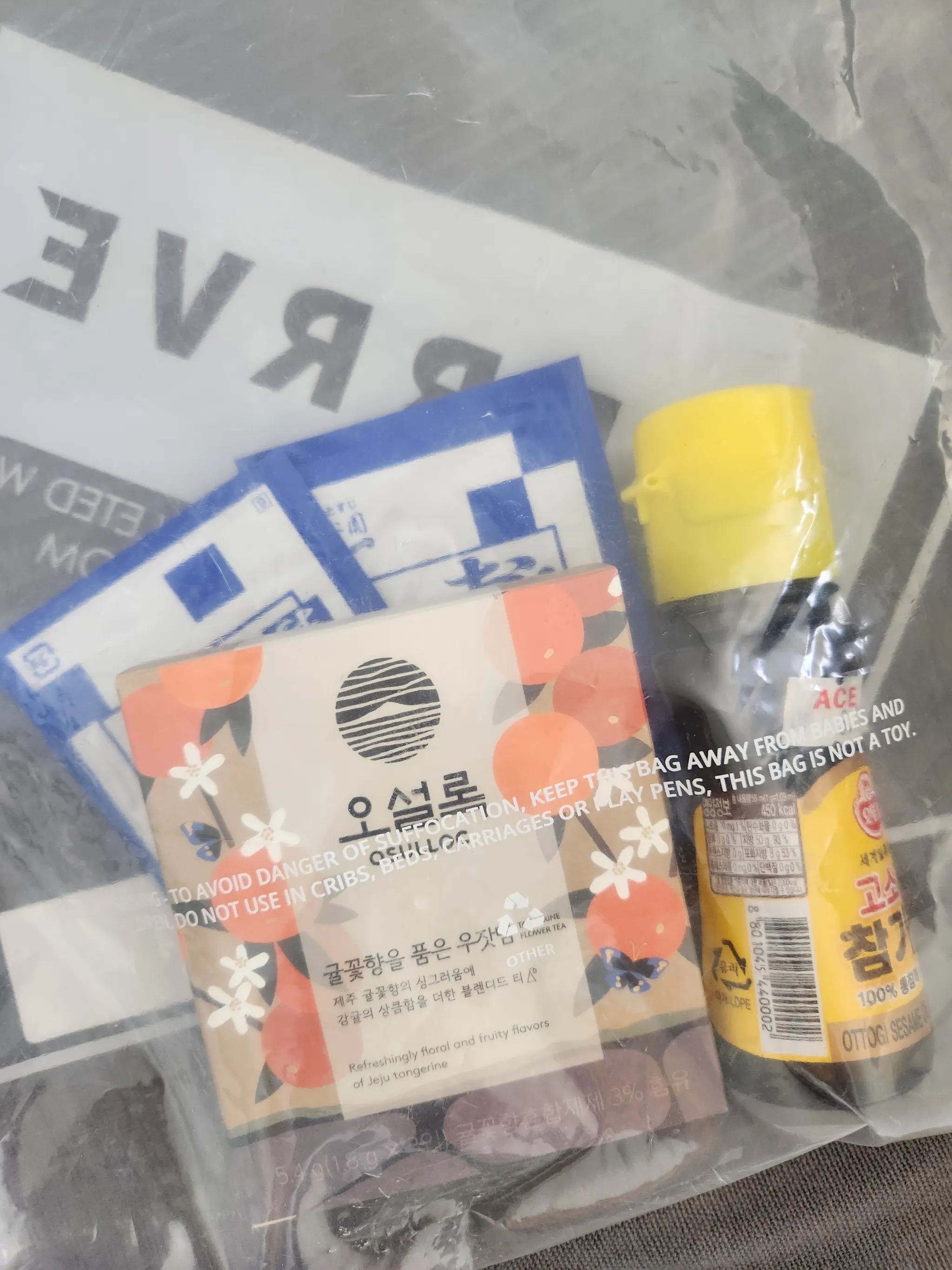 오설록을 챙기다가 참기름에 후리가케를 뿌려 먹는 것을 소개해 주고 싶어서 반쯤 남은 참기름과 후리가케 두 개를 같이 챙겼다. 잘 설명해 주었다.