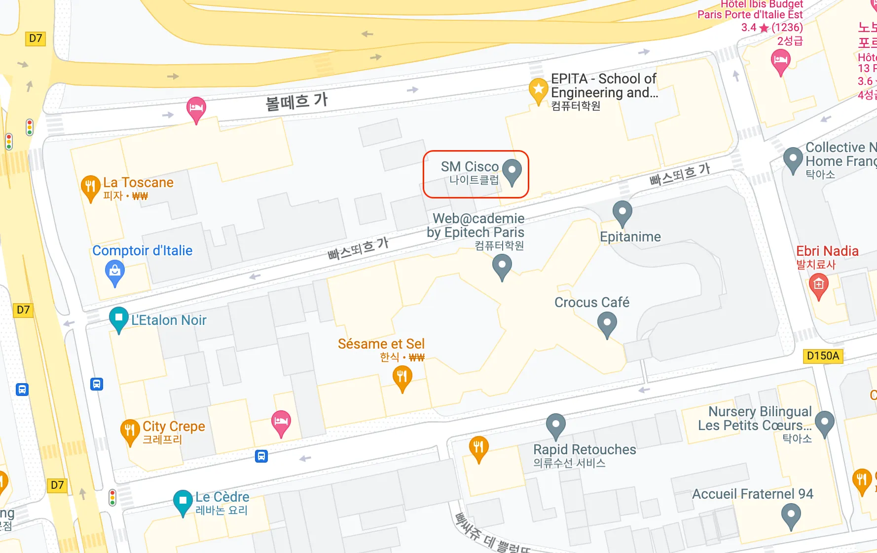 구글 지도에 EPITA 친구들이 또 Cisco를 ‘나이트클럽’으로 만들어 두는 만행을 저질렀다. 실상은 컴퓨터실이다.