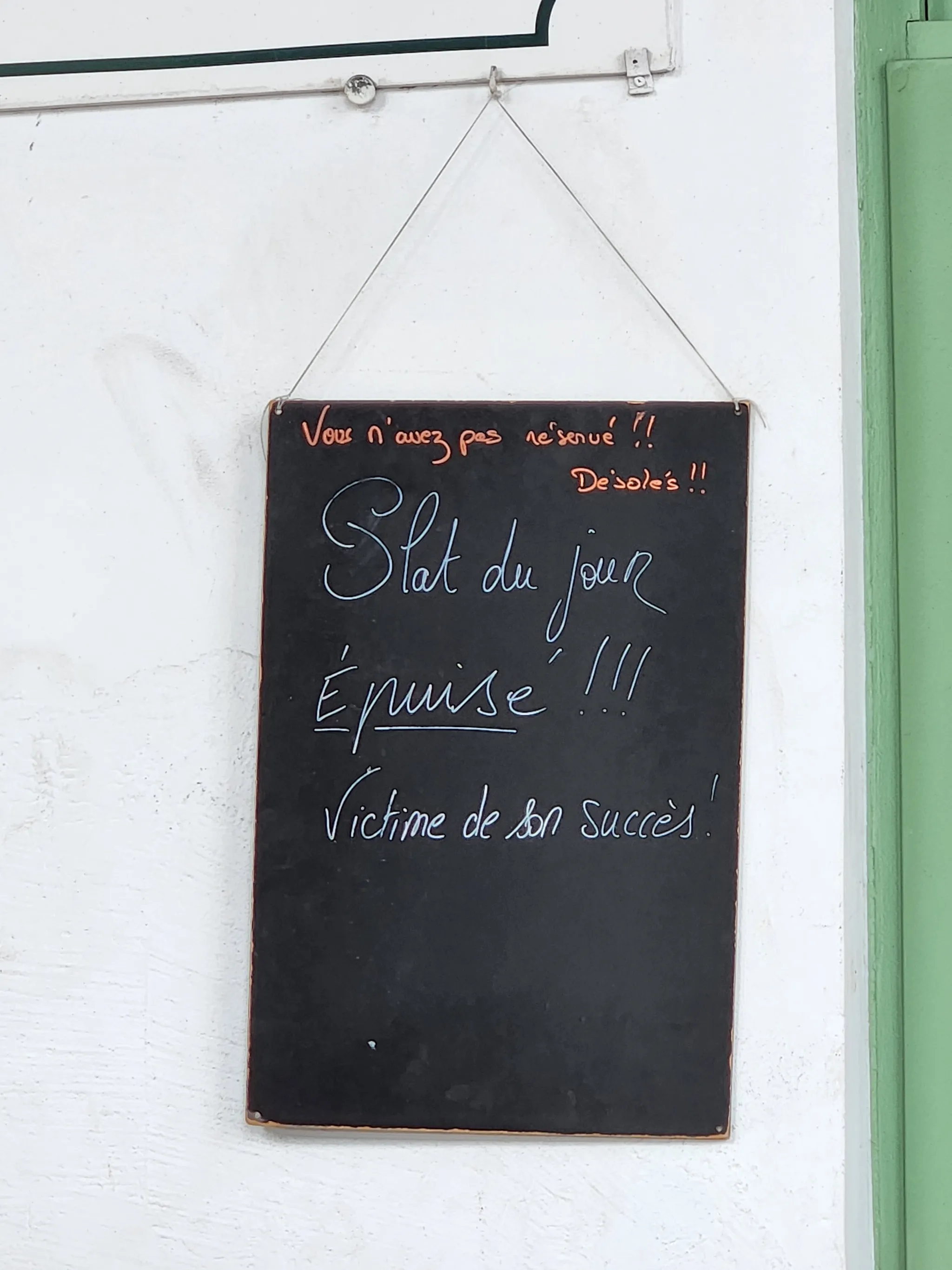 사진이 촬영된 장소는 니스의 한 식당이다. 그런데 보통 오늘의 메뉴가 다 팔렸으면 다 팔린거지 ‘오늘의 메뉴 마감!!! 우리가 만든 성공의 희생양’ 같은 자화자찬 멘트를 직접 흰 분필로 적어 두지는 않았던 것 같다.