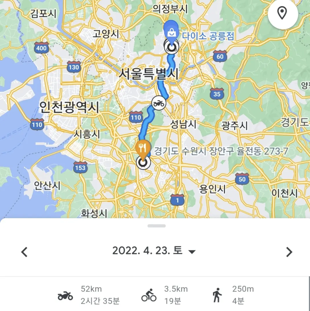 서울 → 수원, 52km, 2시간 30분 주행